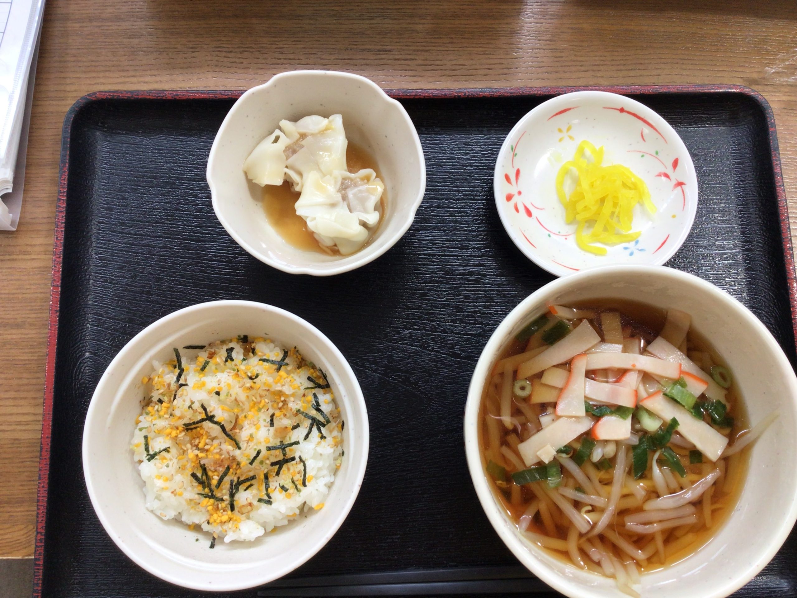 【昼食】 1.ふりかけご飯(小) 2.醤油ラーメン 3.蒸しシューマイ 4.漬物