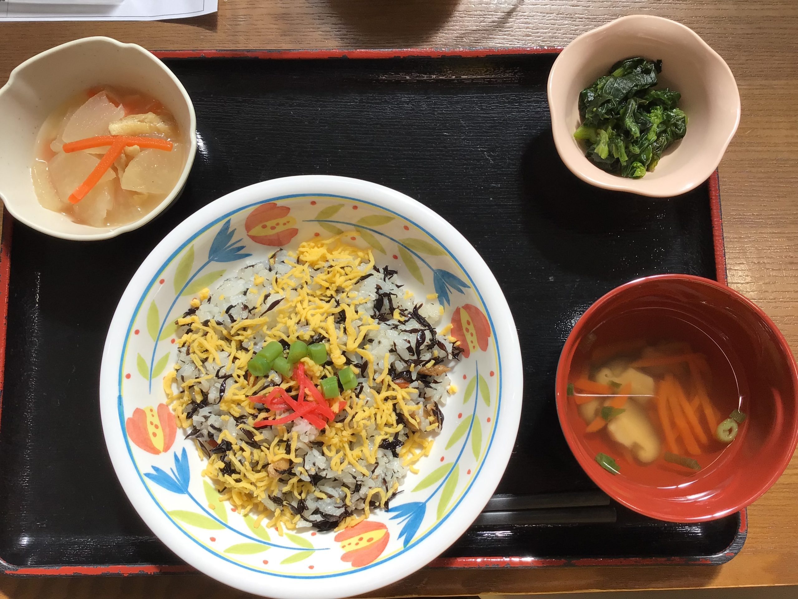 【昼食】 1.ひじきチラシ寿司 2.大根の煮物 3.菜の花のゆず和え 4.すまし汁