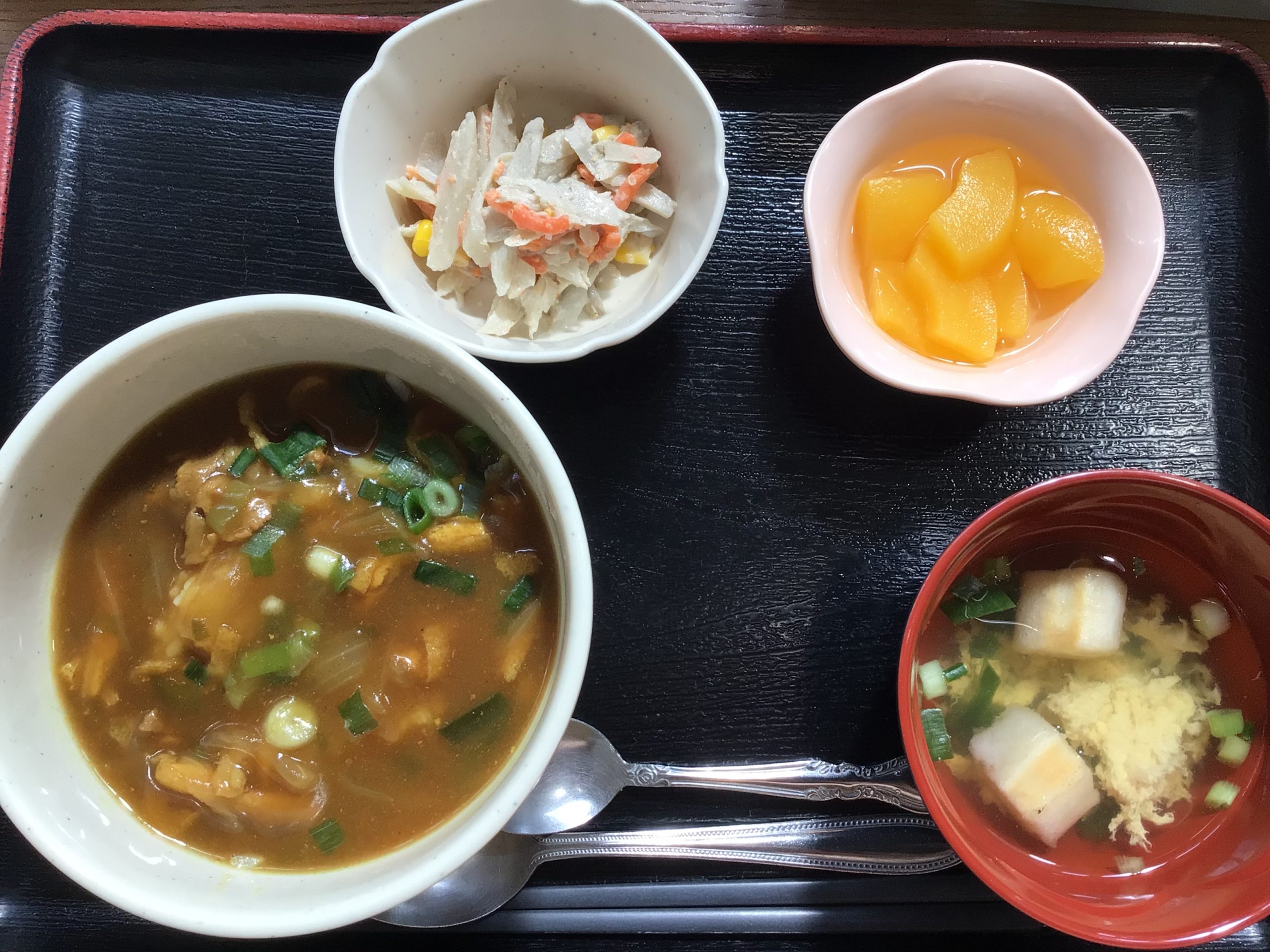 【昼食】 1.カレー丼 2.ごぼうサラダ 3.フルーツ缶(もも) 4.すまし汁