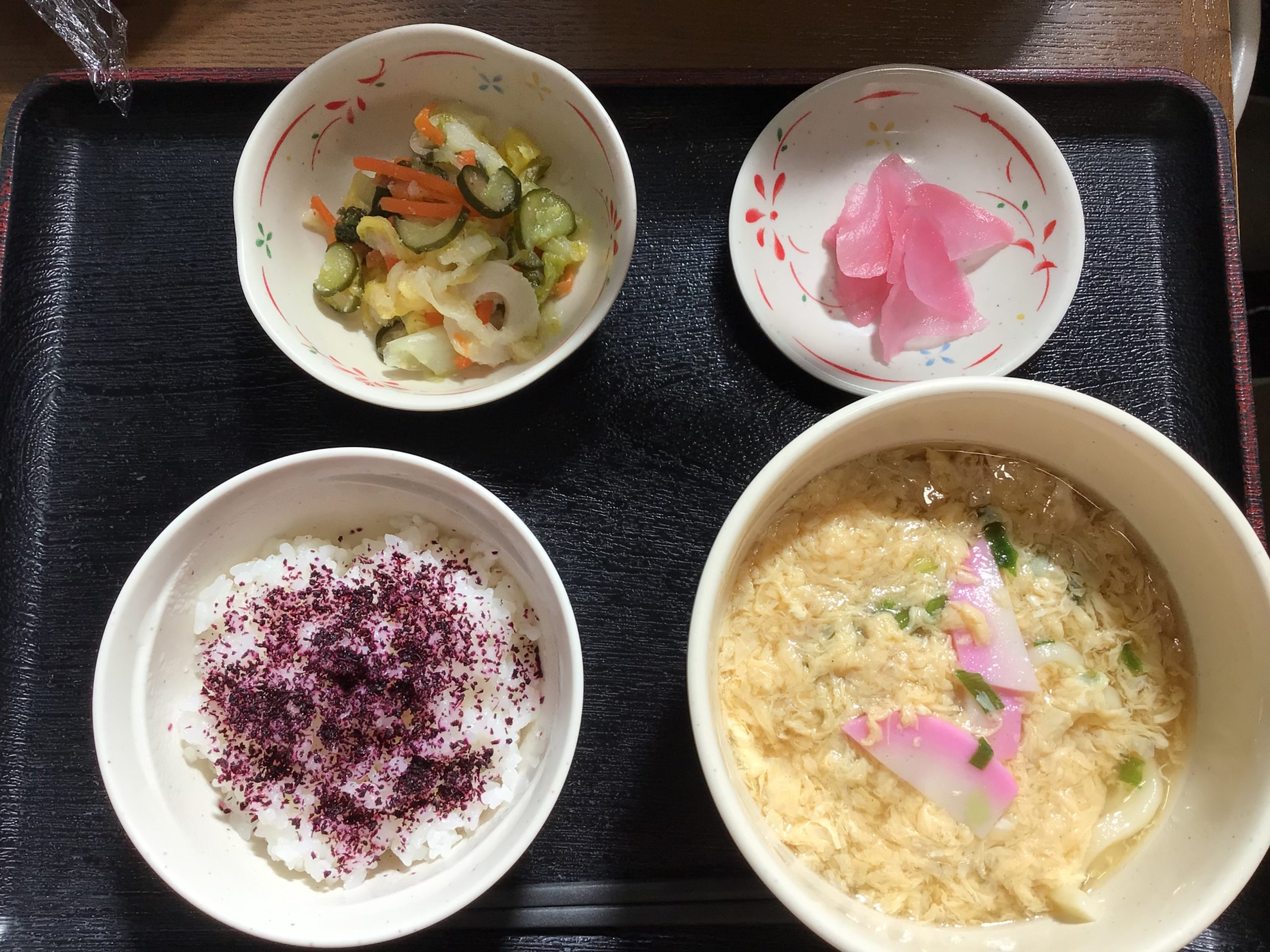【昼食】 1.ゆかりご飯(小) 2.かき玉うどん 3.白菜の胡麻酢和え 4.漬物