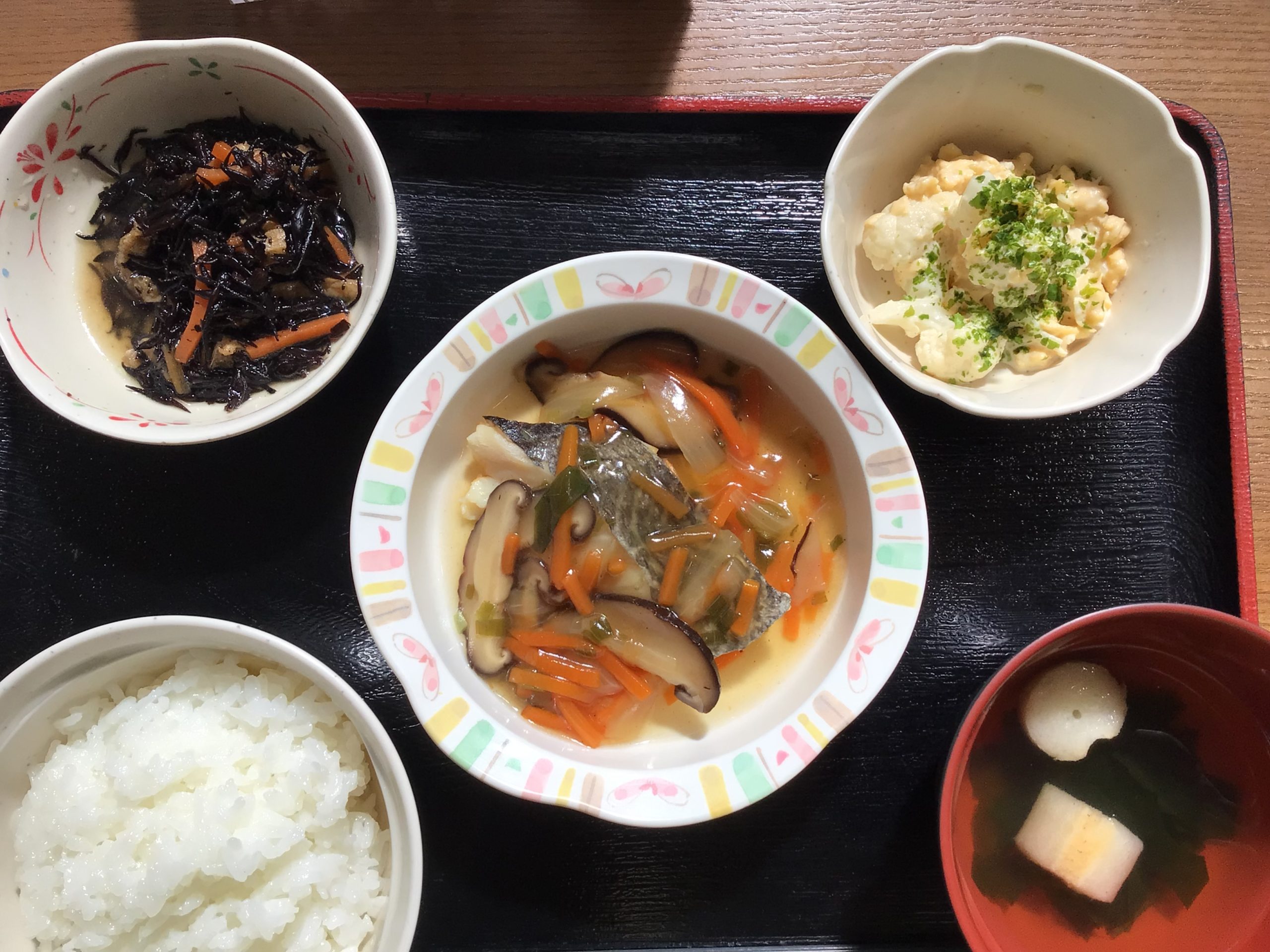 【昼食】 1.ご飯 2.蒸し魚のあんかけ 3.カリフラワーと卵のマヨ和え 4.ひじき煮 5.すまし汁