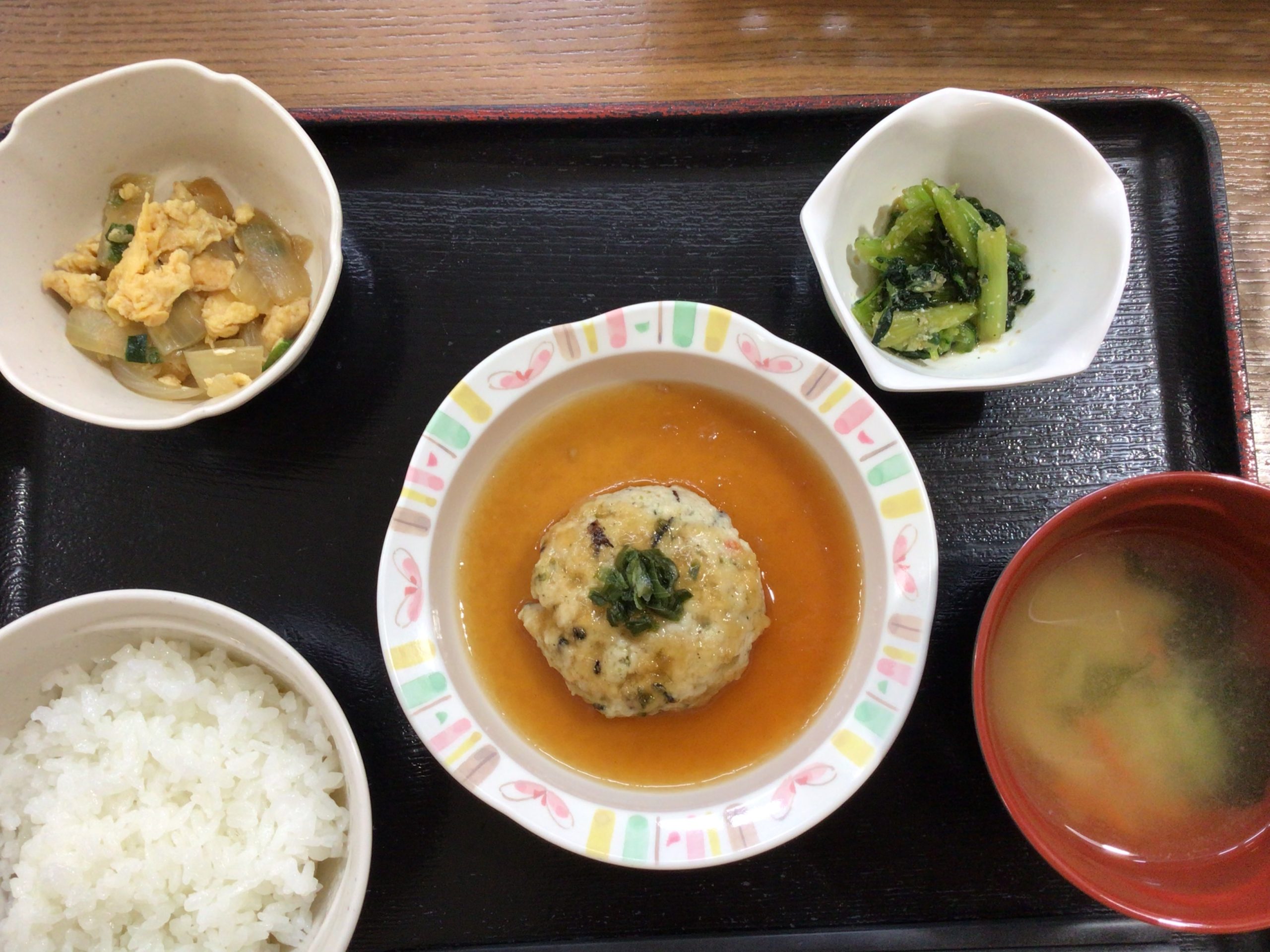 【昼食】 1.ご飯 2.豆腐ハンバーグおろしポン酢 3.ねぎ玉 4.小松菜ごま和え 5.みそ汁