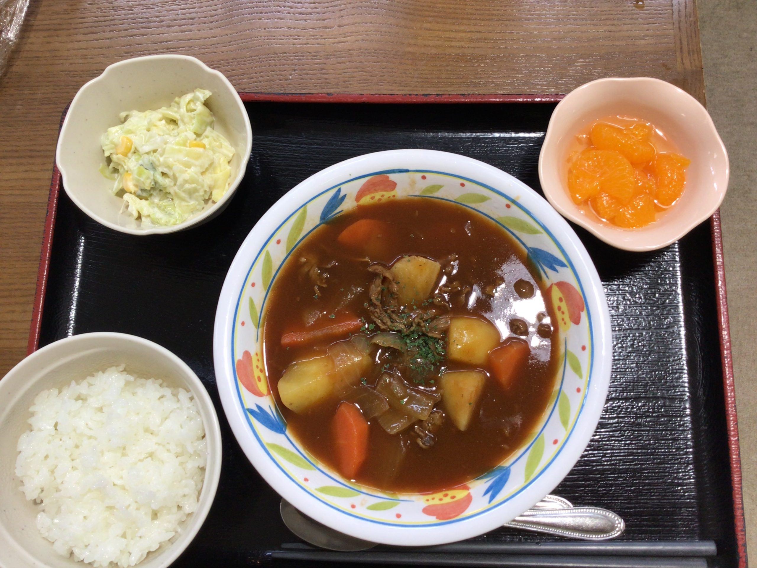 【昼食】 1.ご飯 2.ビーフシチュー 3.キャベツとコーンのサラダ 4.フルーツ缶(みかん)