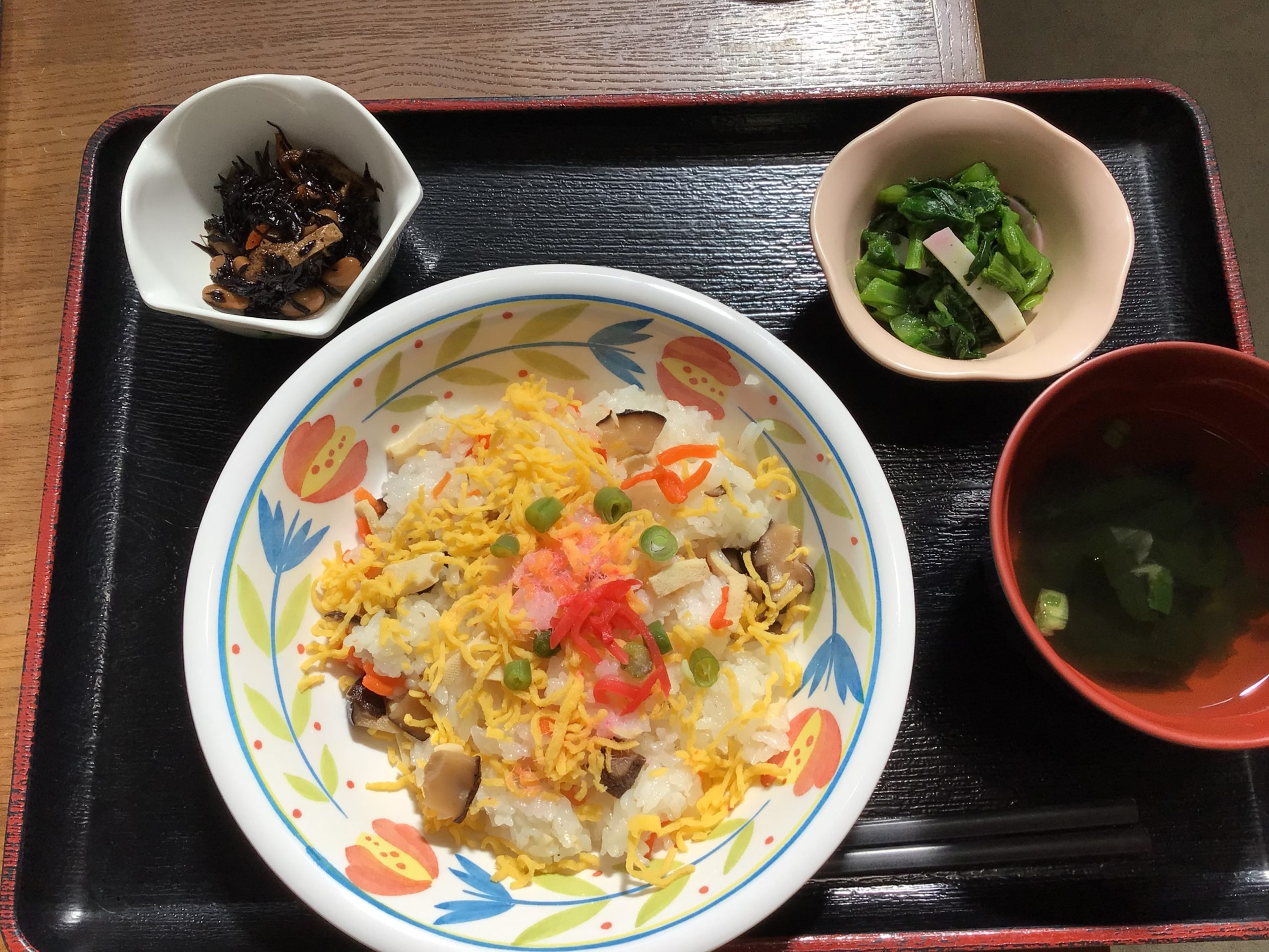 【昼食】 1.雛ちらし寿司 2.菜の花のお浸し 3.ひじき煮 4.すまし汁