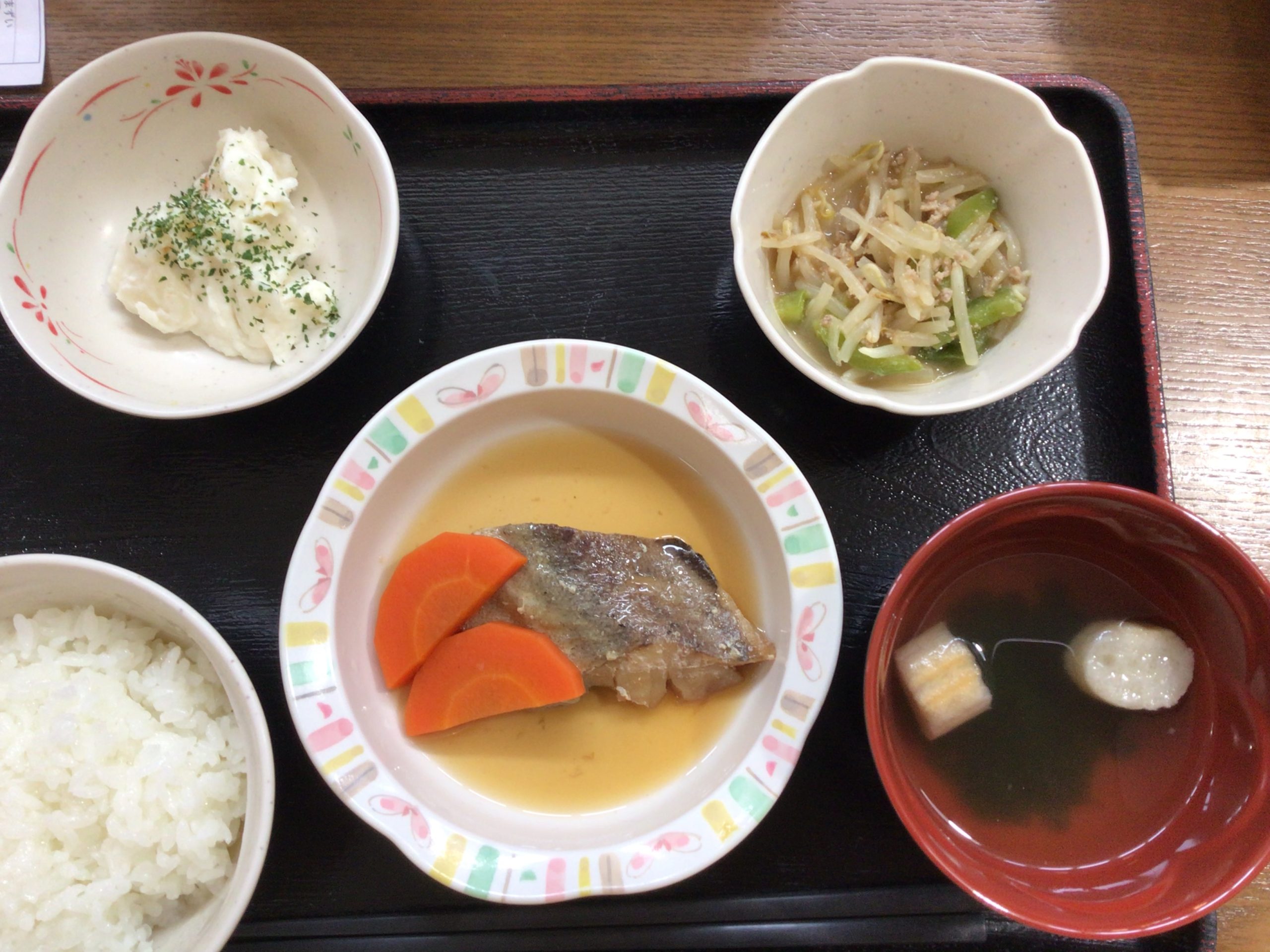 【昼食】 1.ご飯 2.タラの煮魚 3.もやしの肉味噌炒め 4.ポテトサラダ 5.みそ汁