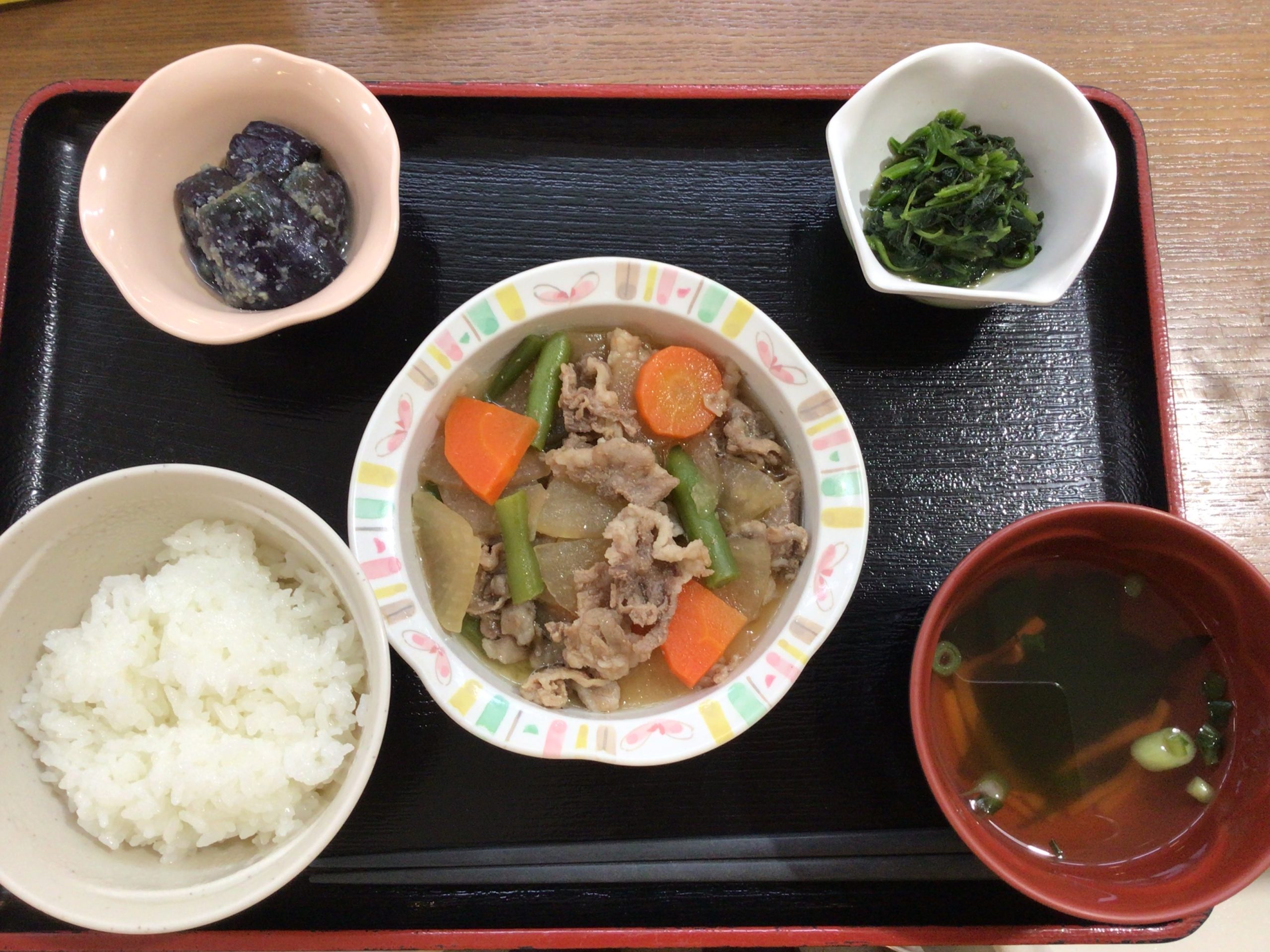 【昼食】 1.ご飯 2.豚と大根の煮物 3.茄子のごま味噌和え 4.ほうれん草のおかか和え 5.すまし汁