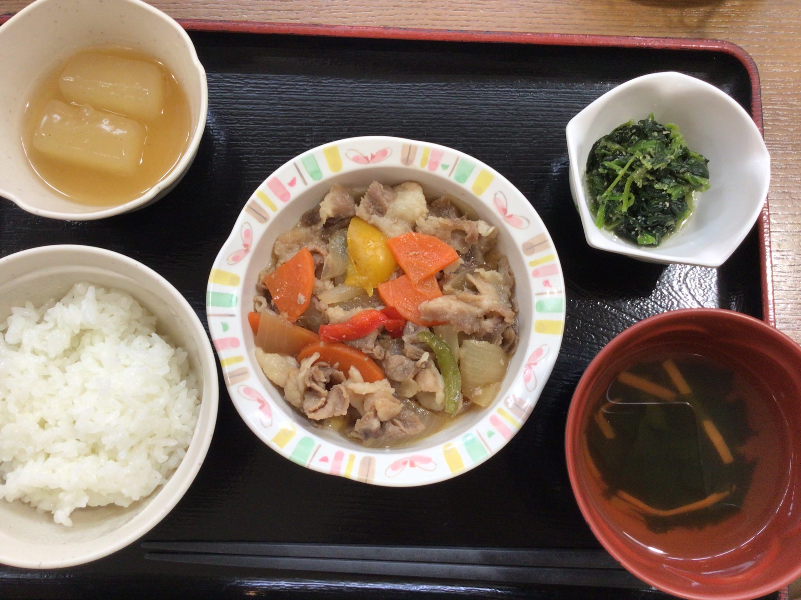 【昼食】 1.ご飯 2.豚肉の生姜炒め 3.冬瓜の煮物4.ほうれん草のごま和え 5.すまし汁
