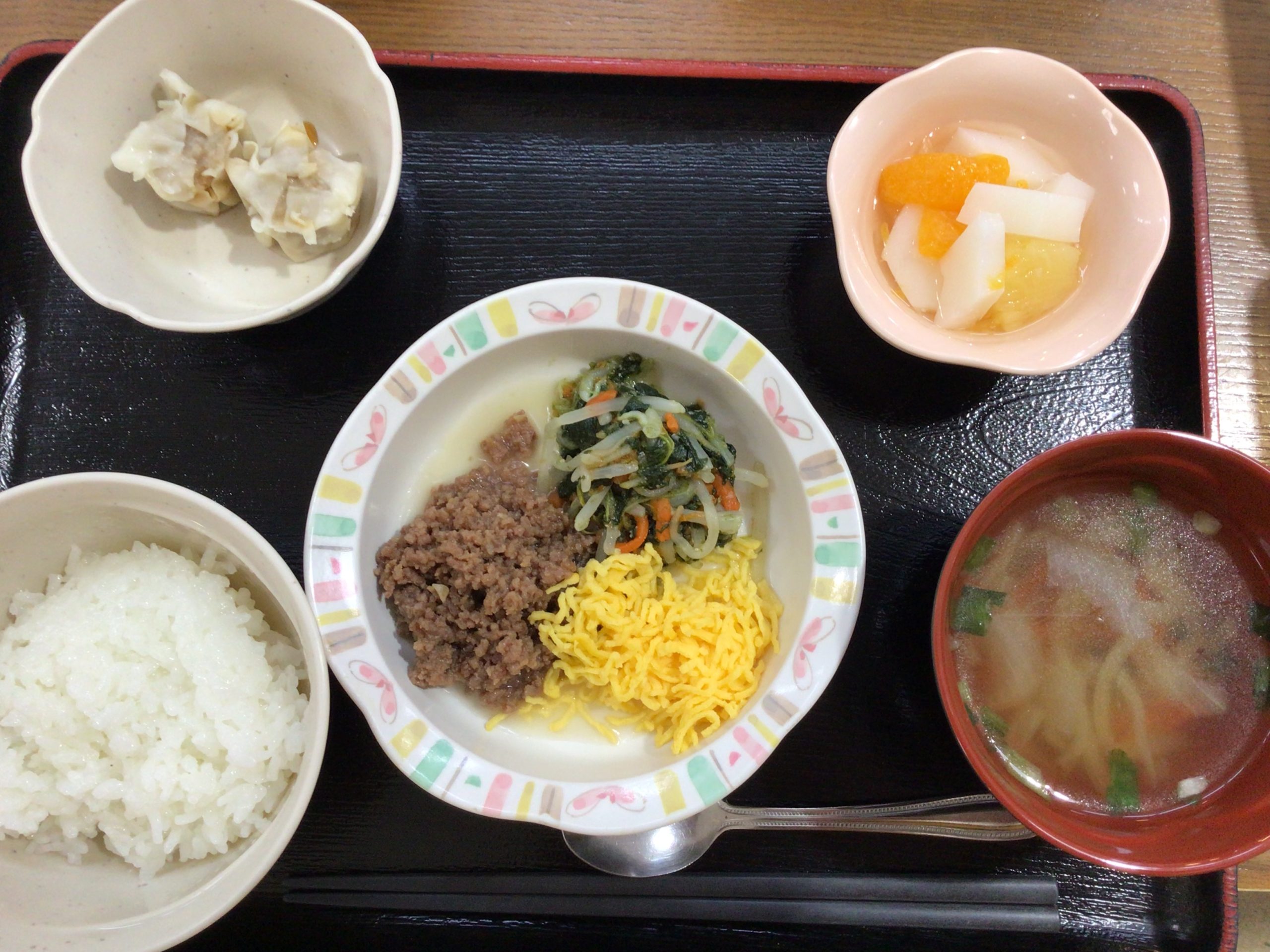 【昼食】 1.ビビンバ 2.蒸しシューマイ 3.フルーツ杏仁豆腐 4.中華風スープ
