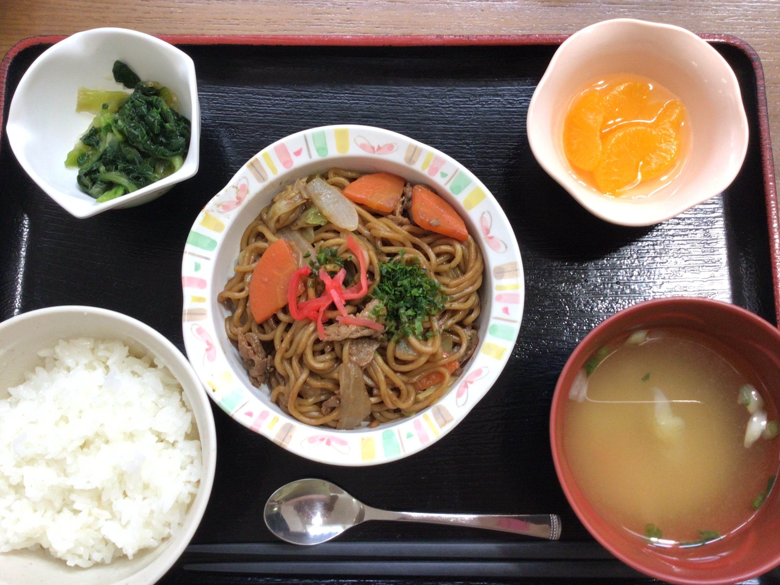 【昼食】 1.ご飯 2.焼きそば 3.青梗菜のお浸し 4.フルーツ缶(みかん) 5.みそ汁
