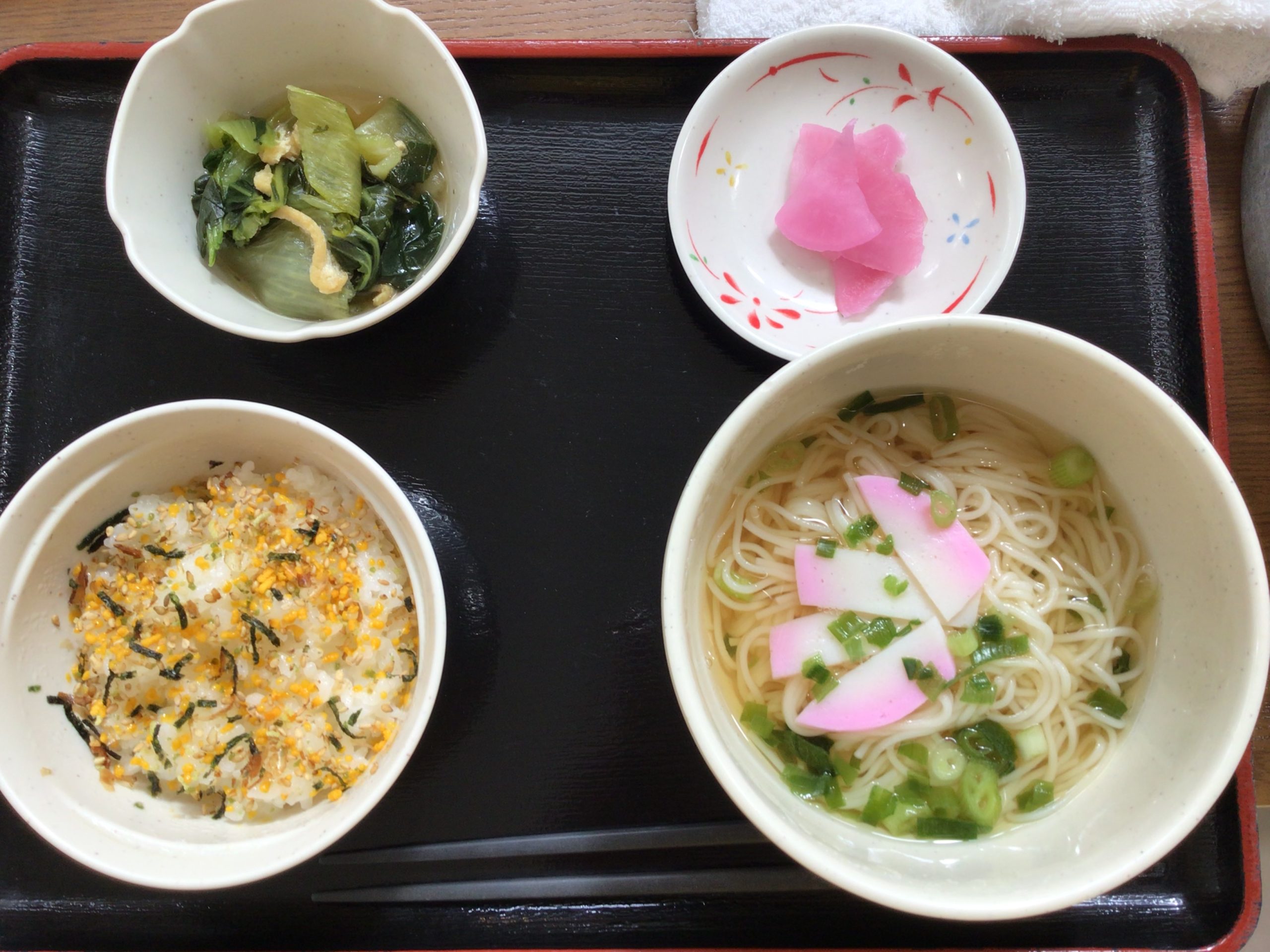 【昼食】 1.ふりかけご飯(小) 2.にゅう麵 3.青梗菜の煮浸し 4.漬物