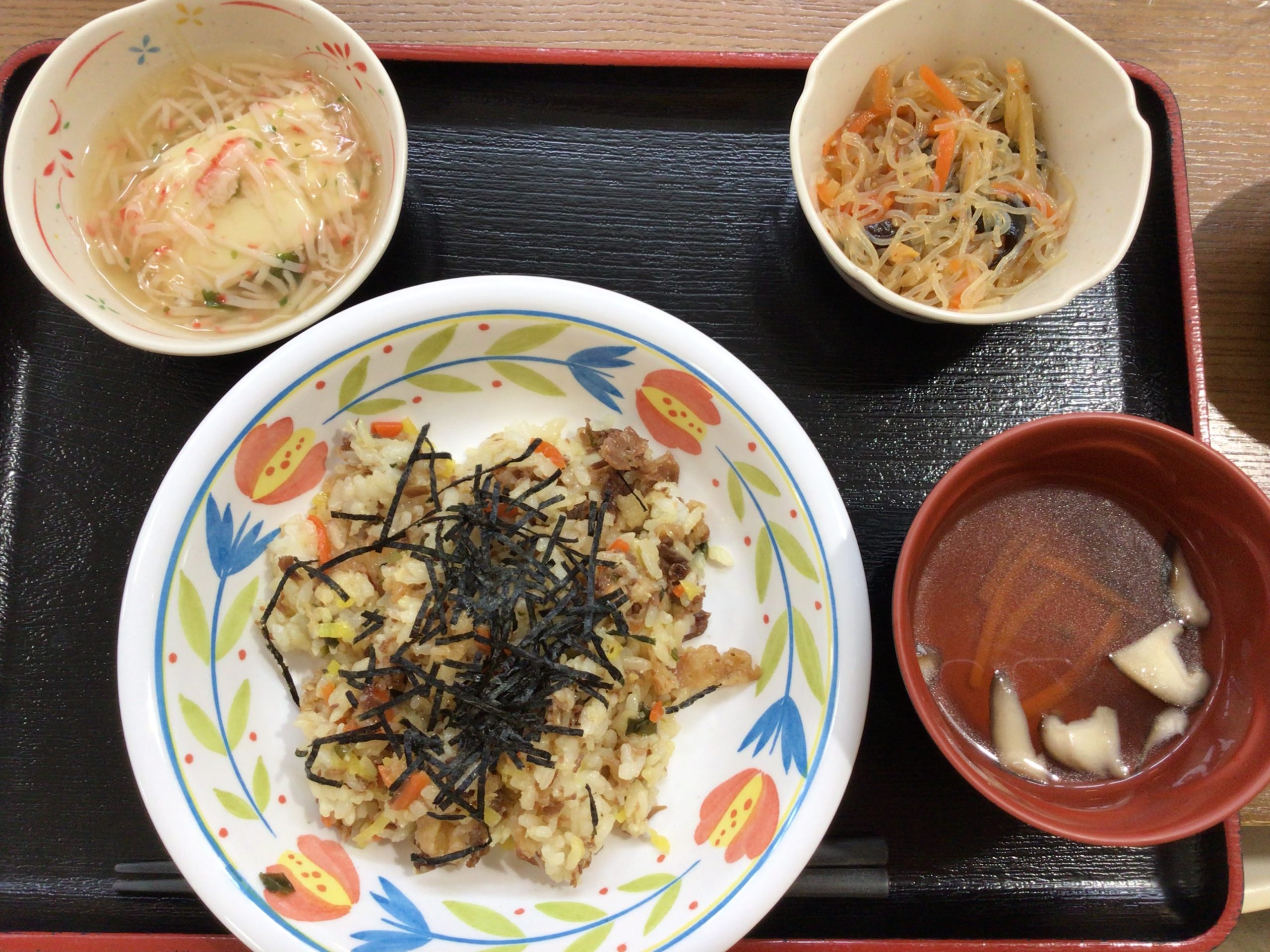【昼食】 1.キンパ風まぜご飯 2.豆腐のあんかけ 3.中華春雨サラダ 4.中華風スープ