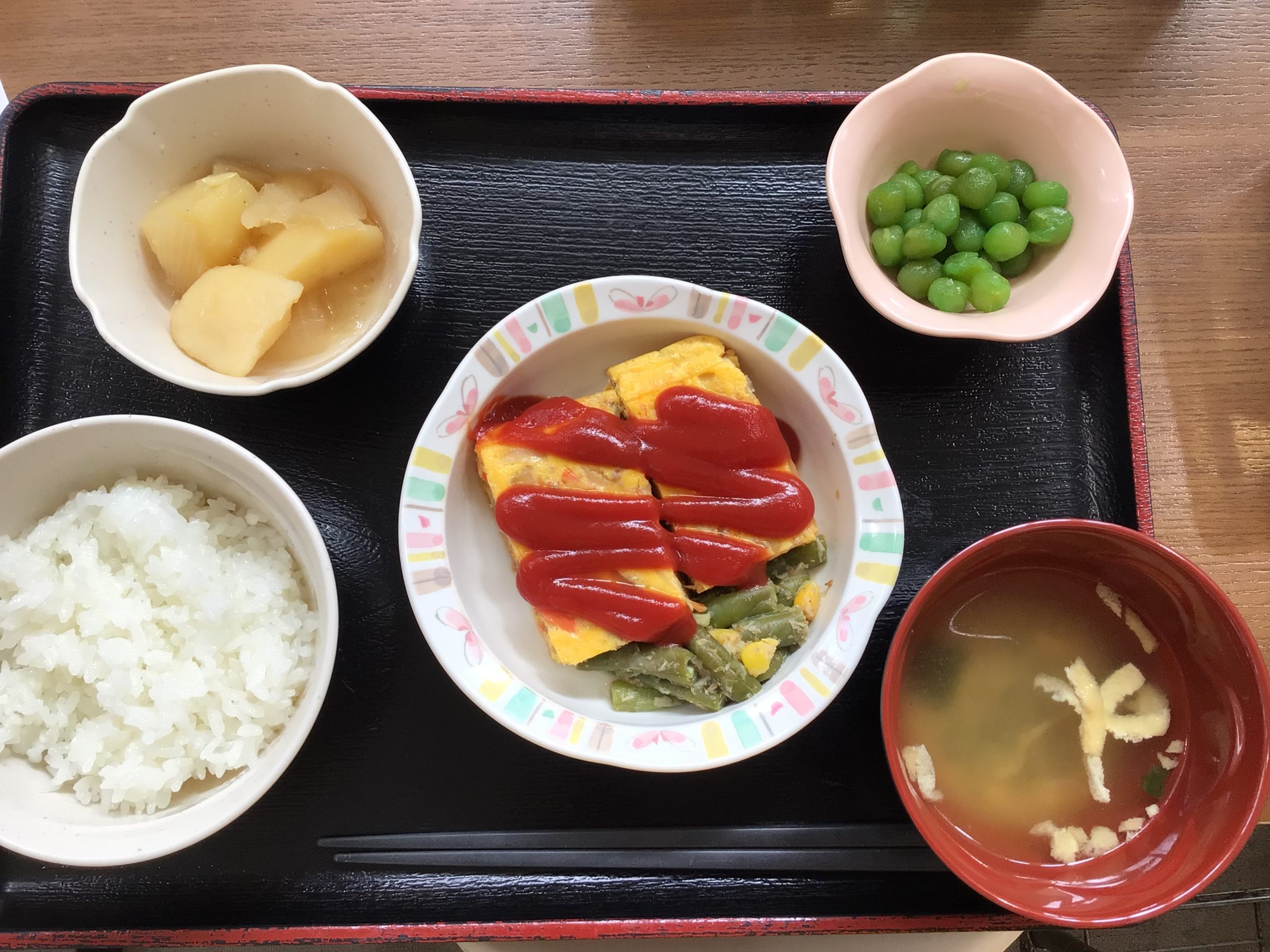 【昼食】 1.ご飯 2.オムレツ 3.(添)いんげんドレ和え4.じゃがいもの煮物 5.うぐいす豆 6.みそ汁
