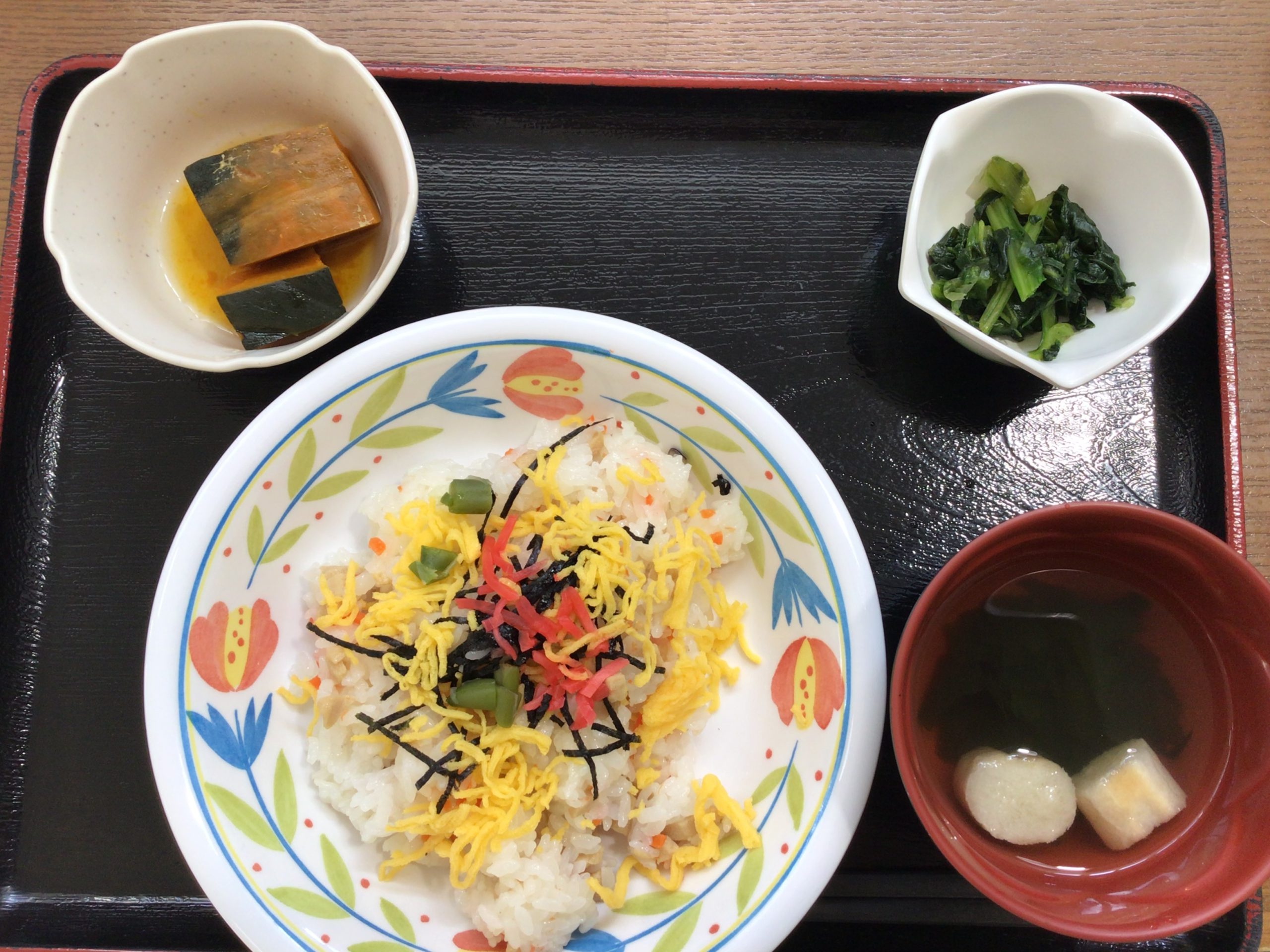 【昼食】 1.五目ちらし寿司 2.かぼちゃの含め煮 3.小松菜のおひたし 4.すまし汁