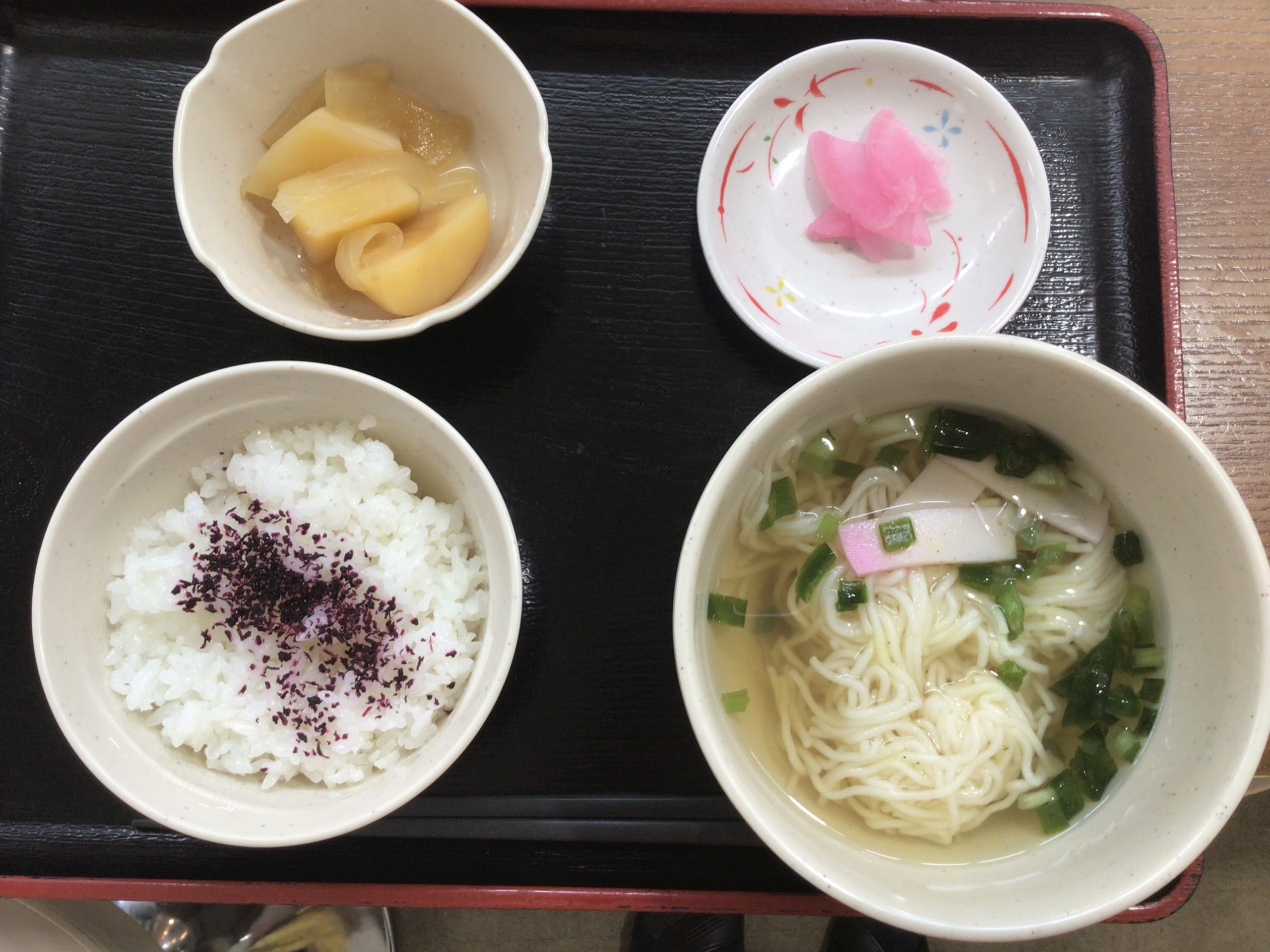 【昼食】 1.ゆかりご飯(小) 2.にゅう麵 3.じゃがいもの煮物 4.漬物