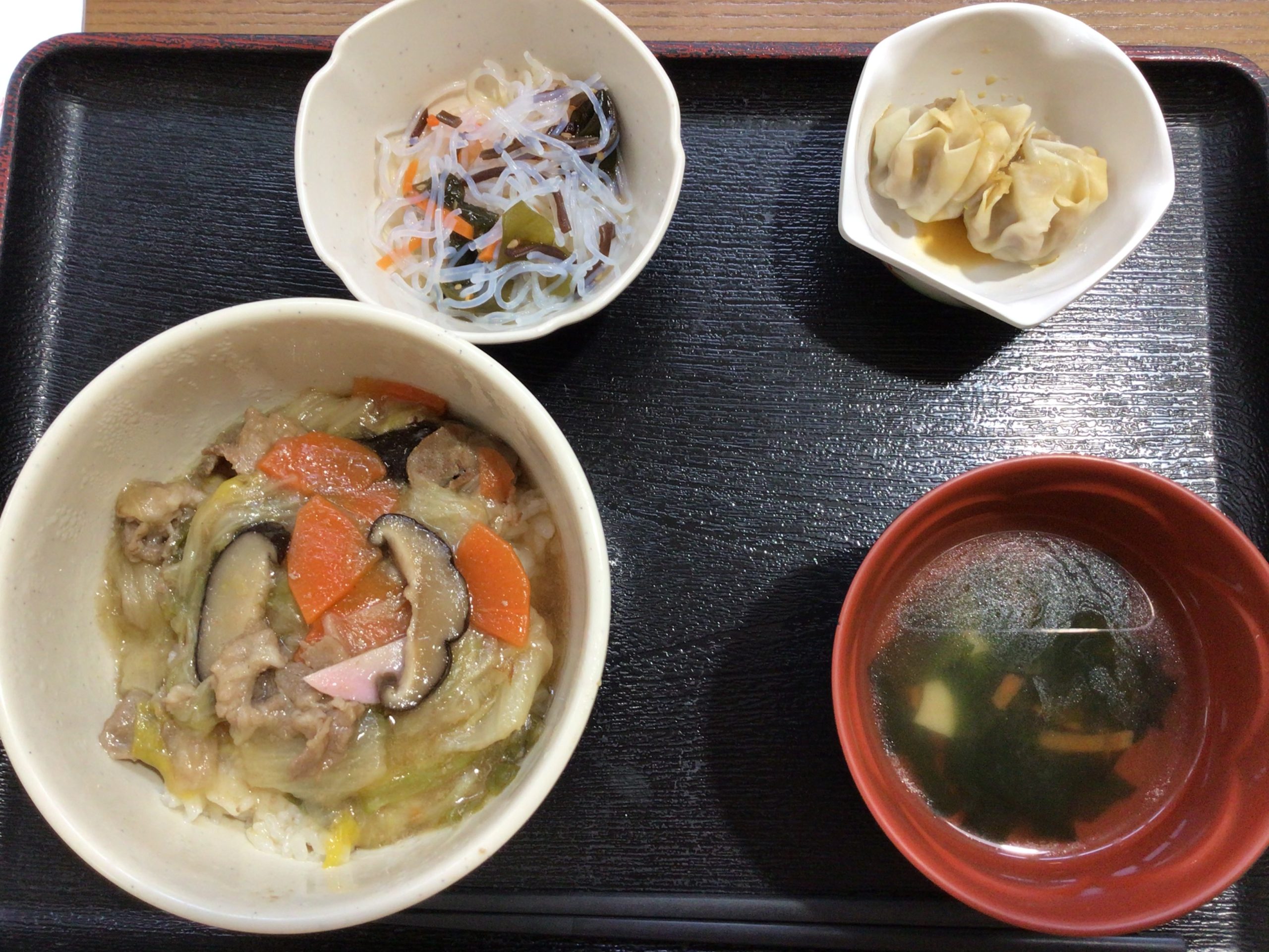 【昼食】 1.中華丼 2.蒸しシューマイ 3.春雨中華サラダ 4.中華風スープ