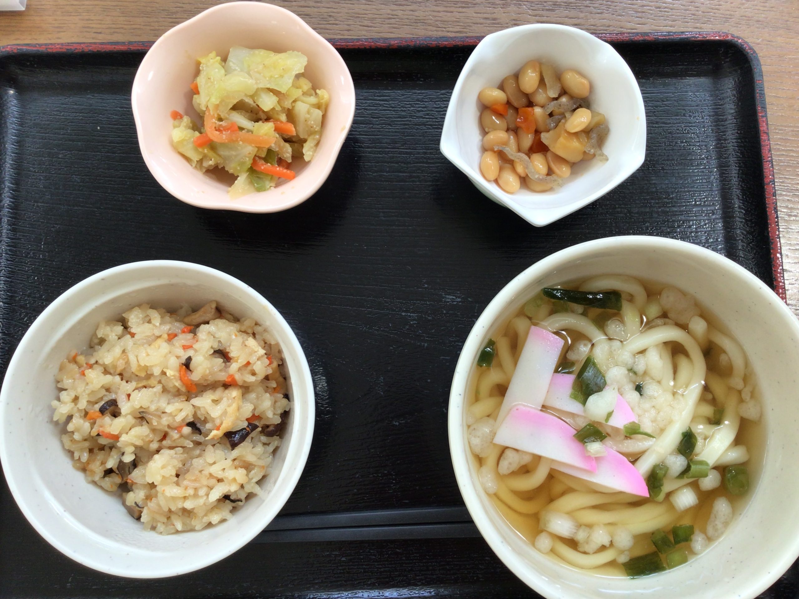 【昼食】 1.炊き込みご飯 2.たぬきうどん 3.キャベツ和風サラダ 4.野菜豆煮 588kcal 蛋白質16.4g 脂質5.1g 食塩3.8g