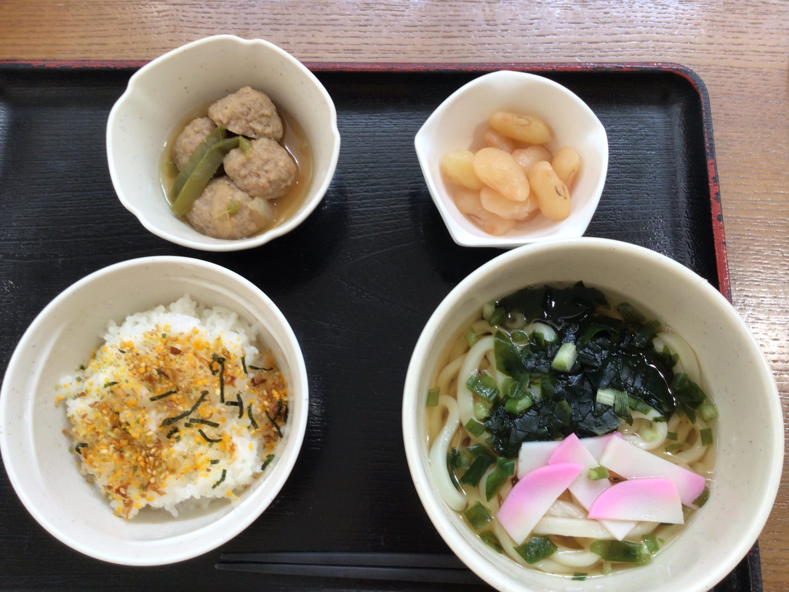 【昼食】 1.ふりかけご飯 2.わかめうどん 3.肉団子甘煮 4.白花豆