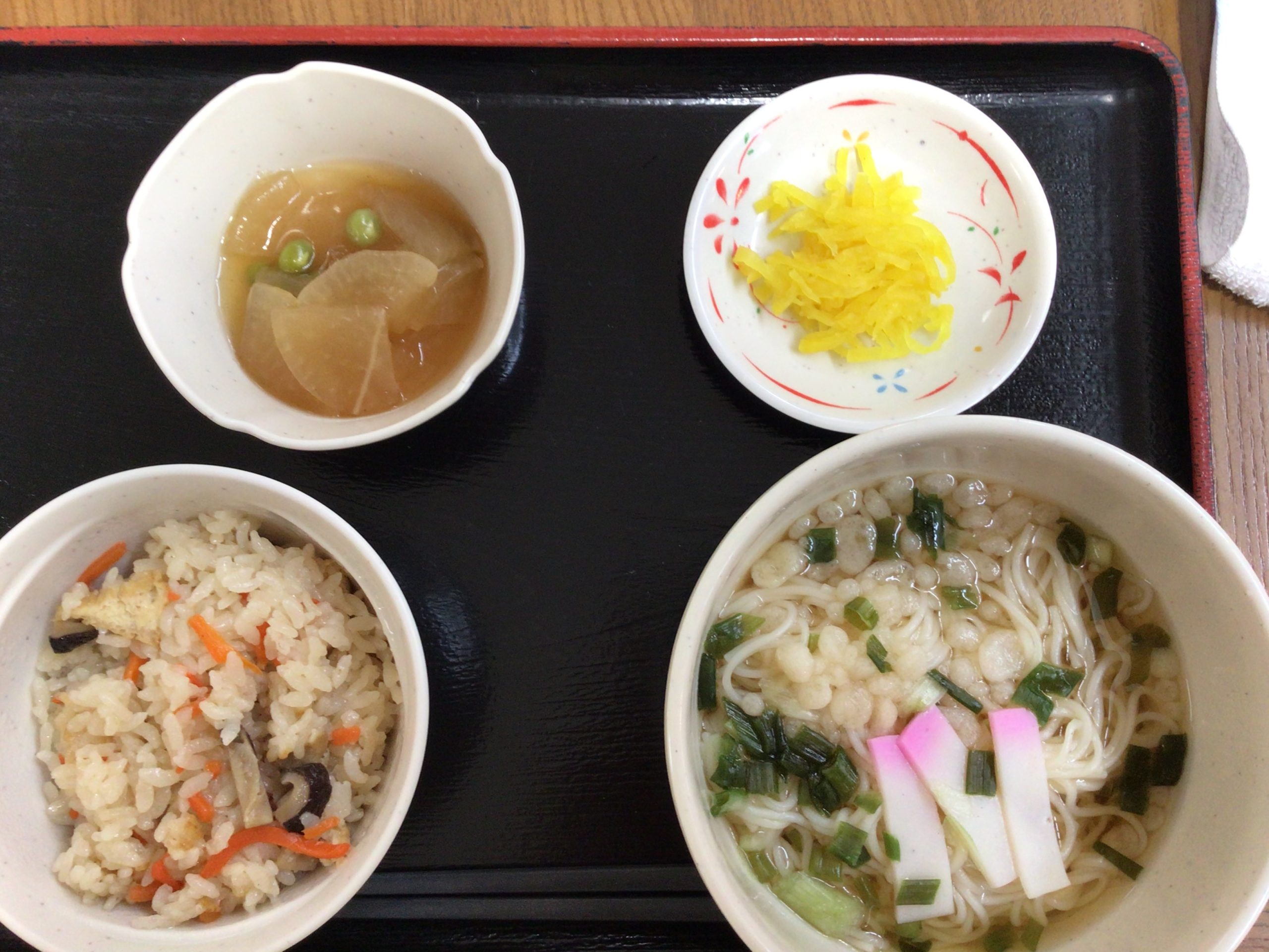 【昼食】 1.かやくご飯(小) 2.にゅう麵 3.大根のくず煮 4.漬物