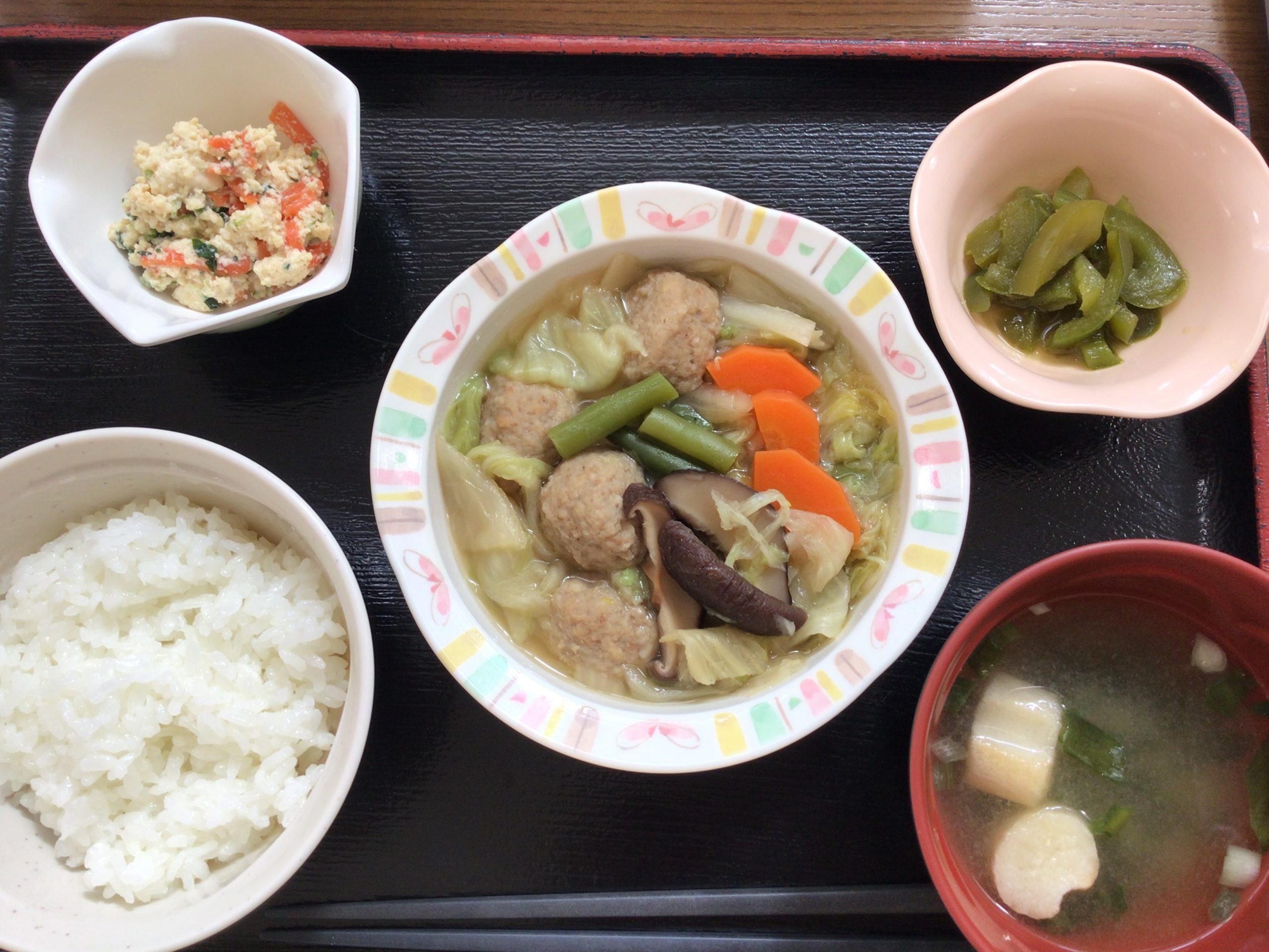 【昼食】 1.ご飯 2.肉団子と野菜の煮物 3.白和え 4.ピーマン甘辛炒め 5.みそ汁