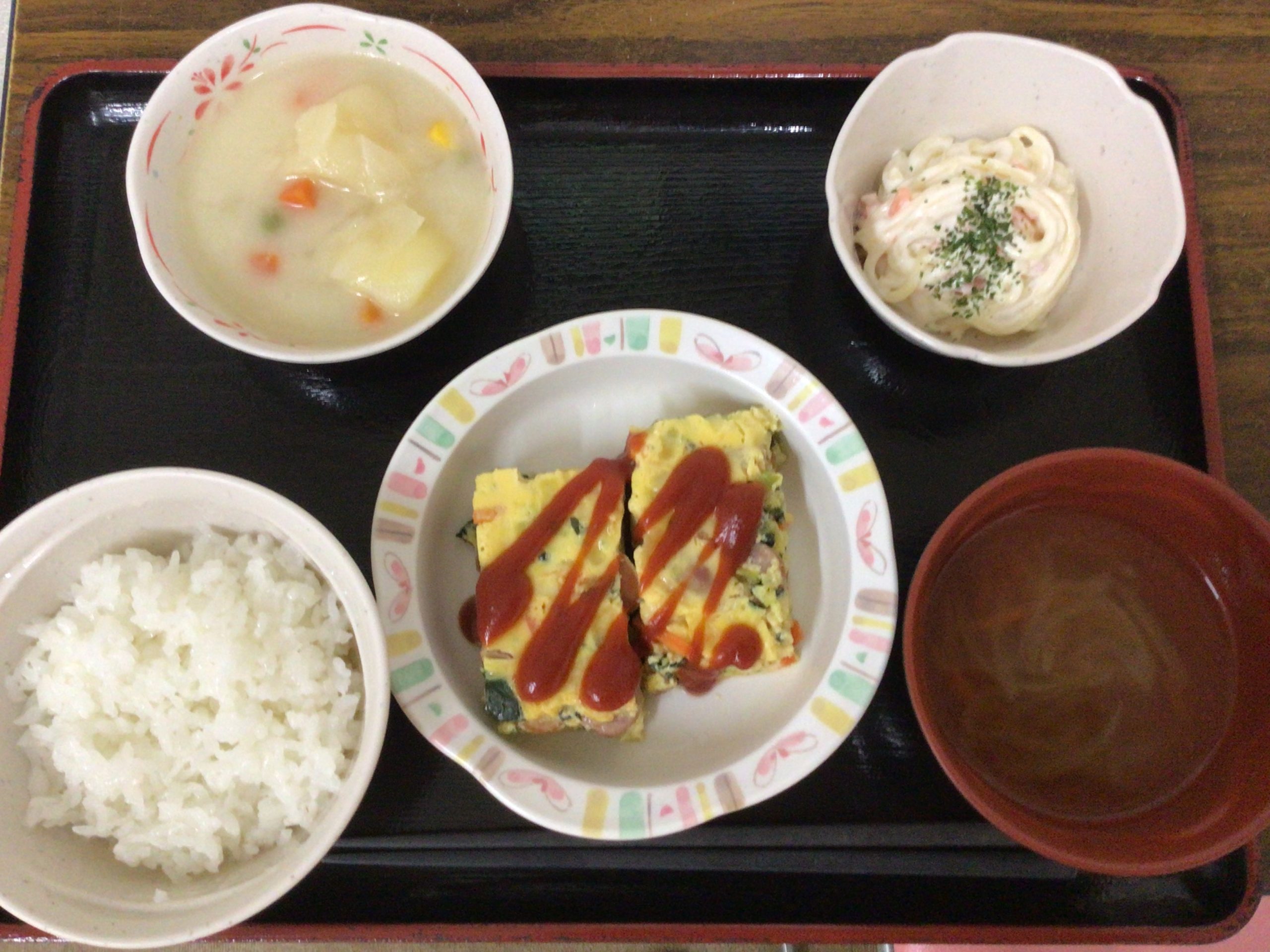 【昼食】 1.ご飯 2.スペイン風オムレツ 3.じゃがいものクリーム煮 4.スパゲティサラダ 5.コンソメスープ