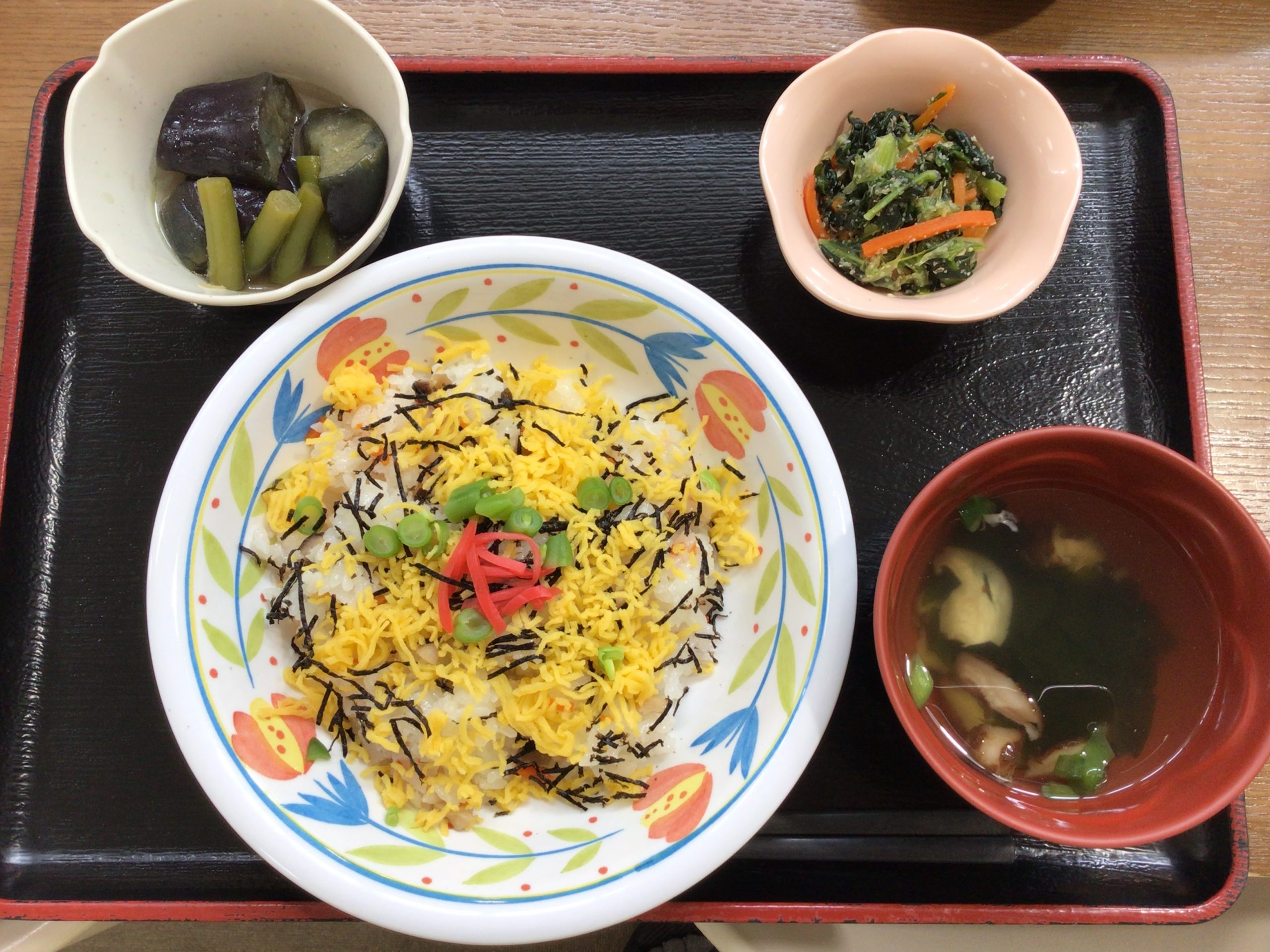 【昼食】 1.五目チラシ寿司 2.なす生姜煮 3.ごま和え(小松菜) 4.すまし汁 529kcal 蛋白質11.0g 脂質8.8g 食塩5.4g