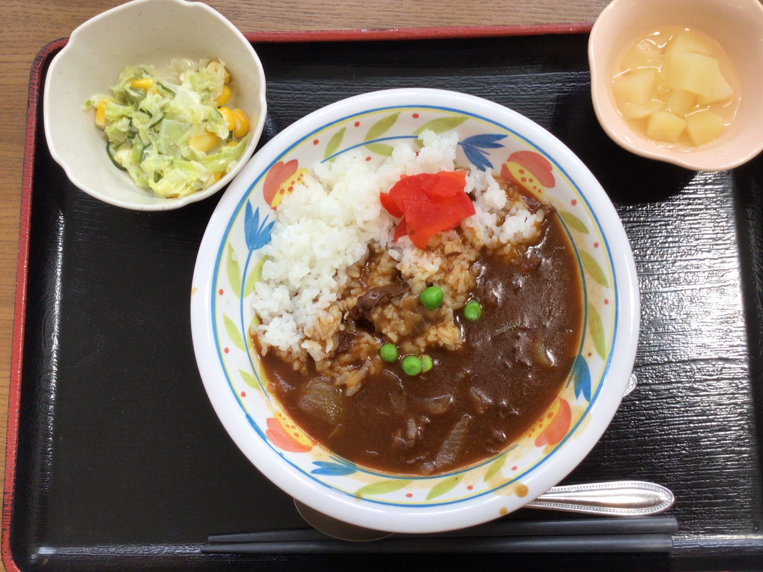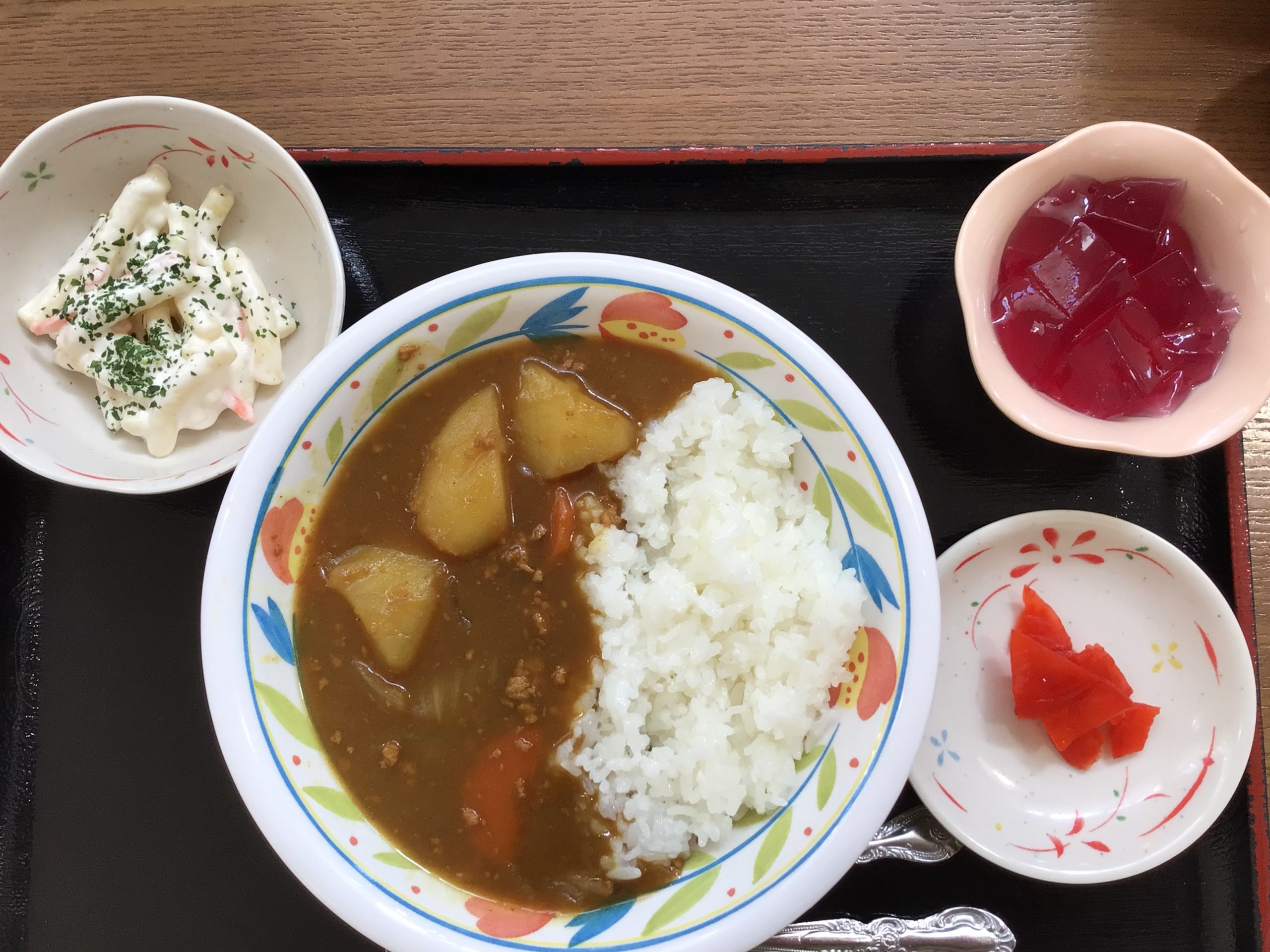 【昼食】 1.カレーライス 2.福神漬け 3.マカロニサラダ 4.ゼリー 658kcal 蛋白質13.1g 脂質15.7g 食塩2.0g