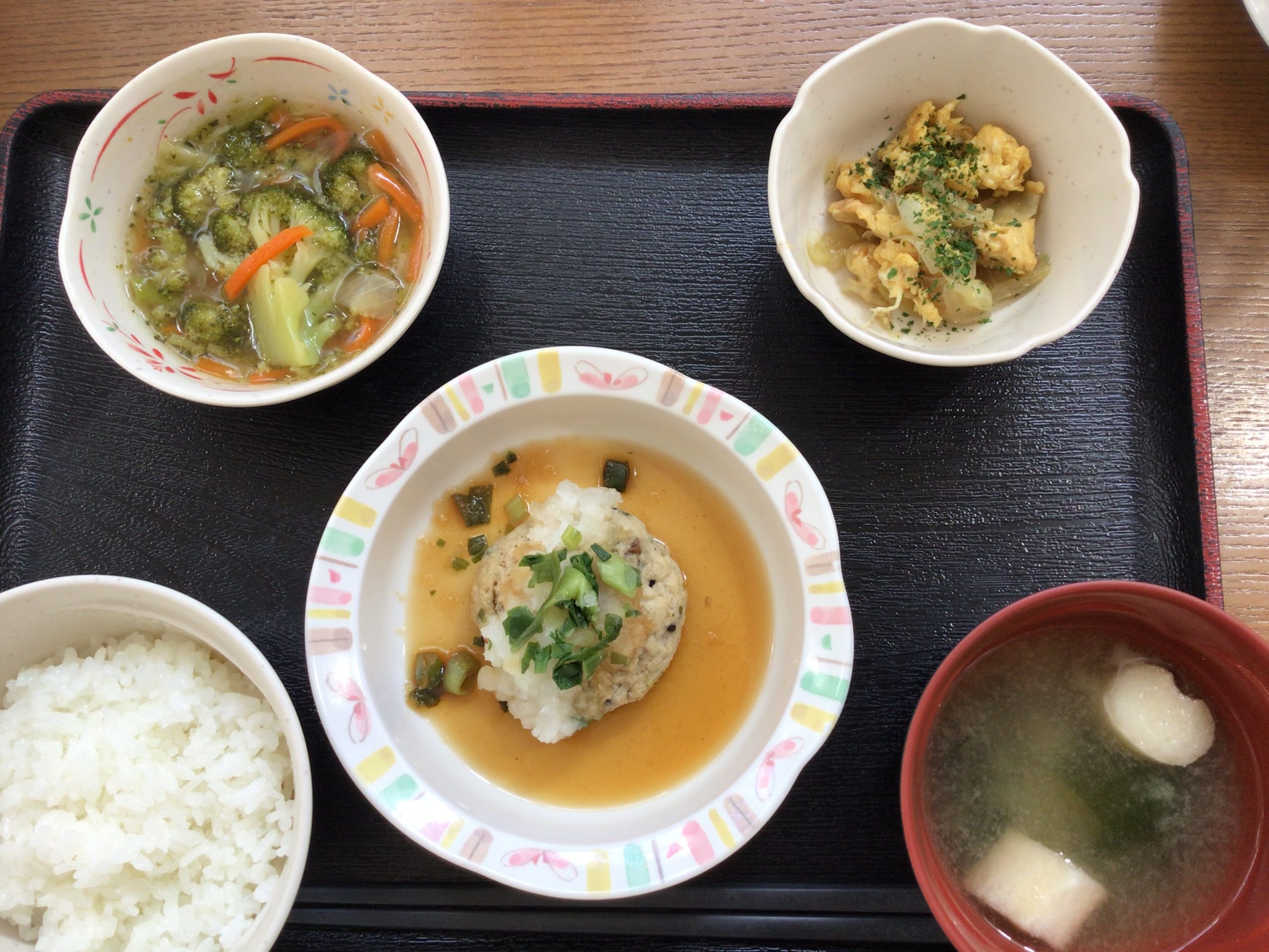 【昼食】 1.米飯 2.豆腐ハンバーグ(大根おろし) 3.ねぎ玉 4.ブロッコリー人参あんかけ 5.みそ汁 598kcal 蛋白質17.4g 脂質13.2g 食塩3.8g