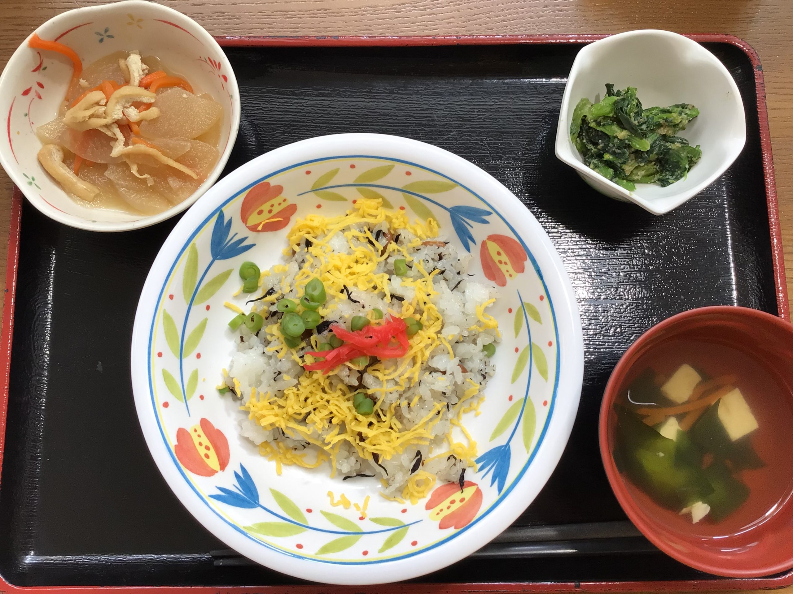 【昼食】 1.ひじきチラシ 2.煮物(大根) 3.ごま味噌和え(菜の花) 4.すまし汁 484kcal 蛋白質11.3g 脂質4.0g 食塩4.2g