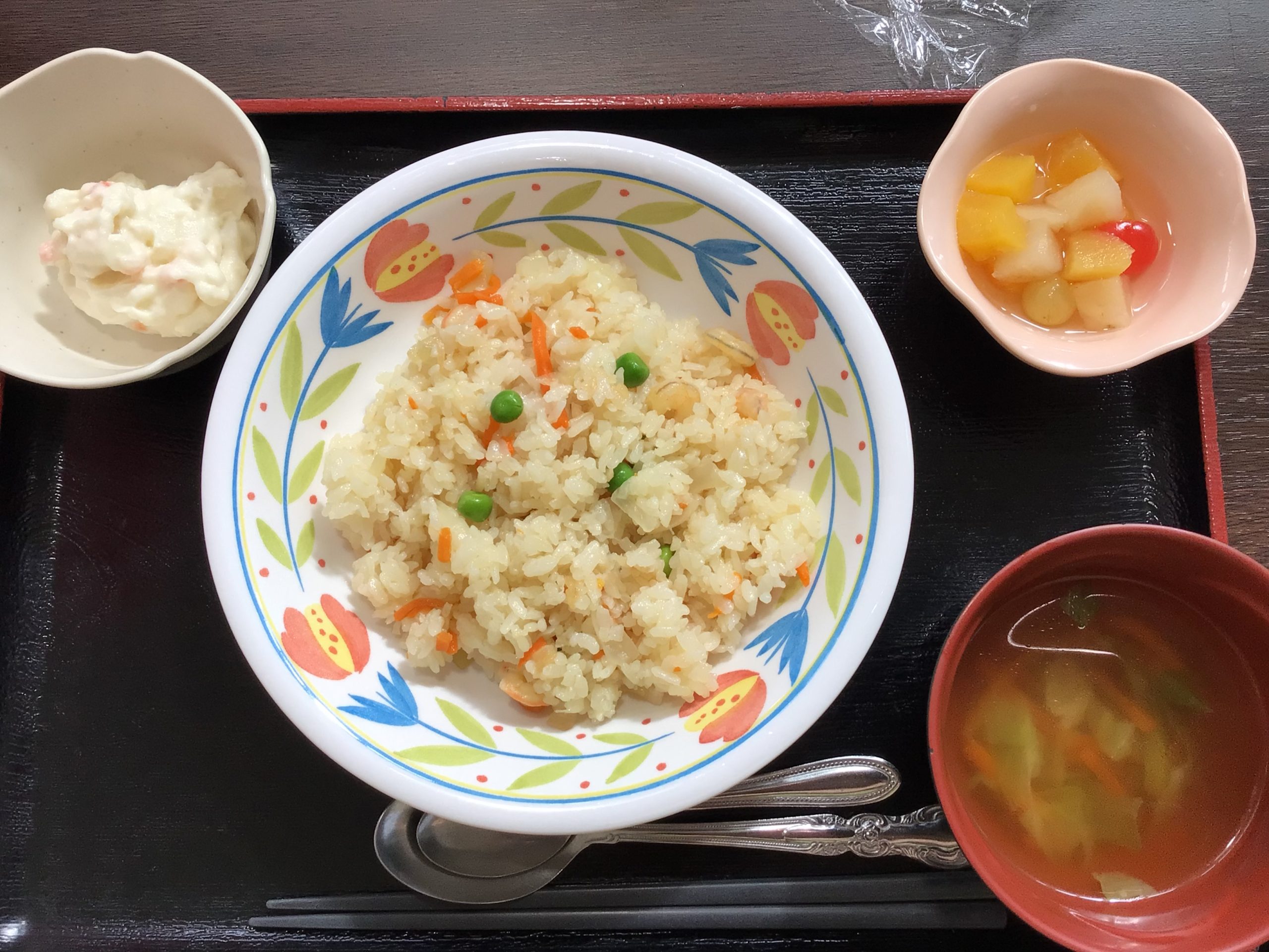 【昼食】 1.炊き込みピラフ 2.ポテトサラダ 3.フルーツ缶 4.コンソメスープ 446kcal 蛋白質10.0g 脂質7.0g 食塩0.7g