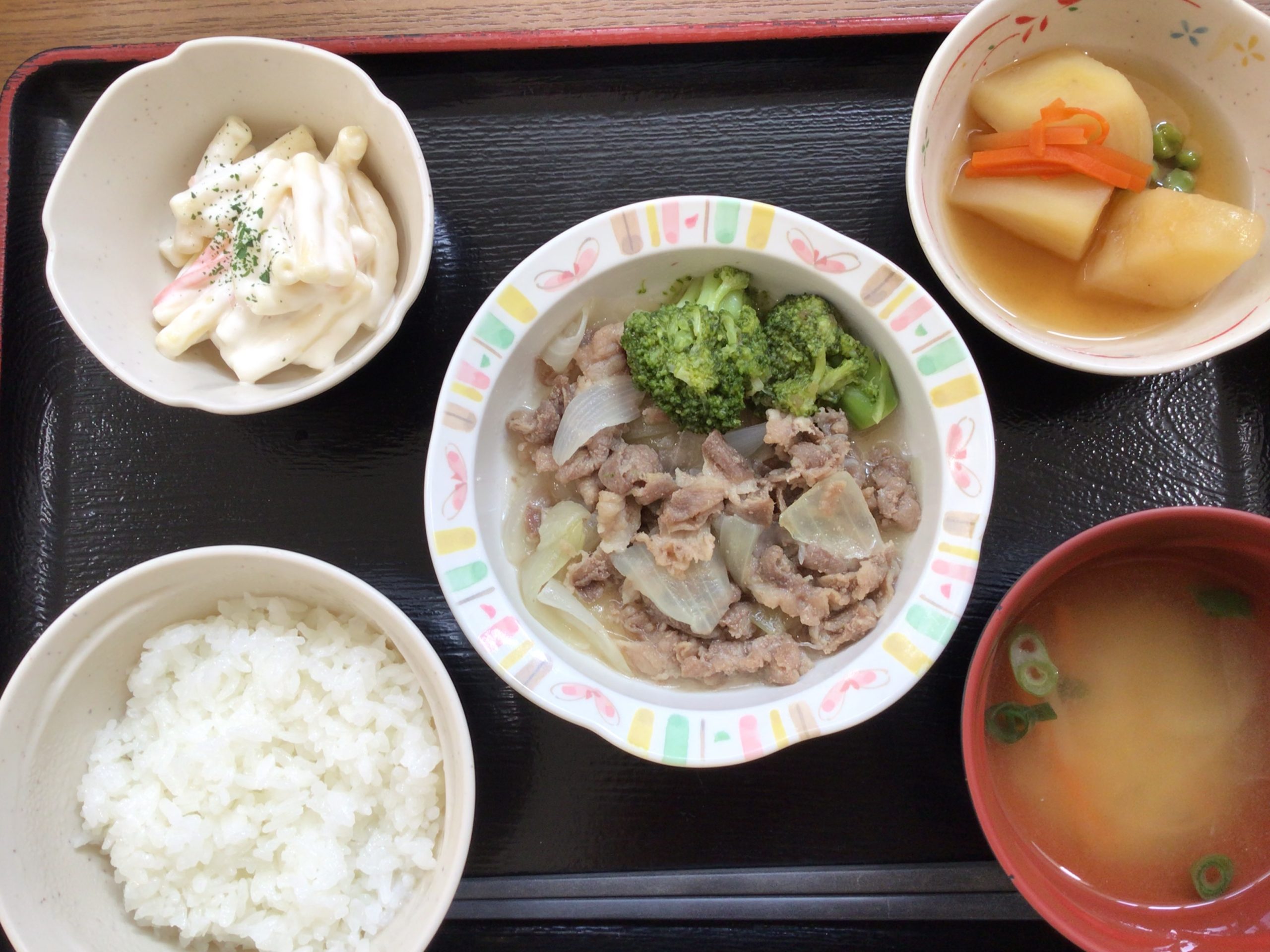 【昼食】 1.米飯 2.豚肉の塩ダレ焼き 3.煮物(じゃが芋) 4.マカロニサラダ 5.みそ汁 637kcal 蛋白質17.8g 脂質12.3g 食塩2.7g