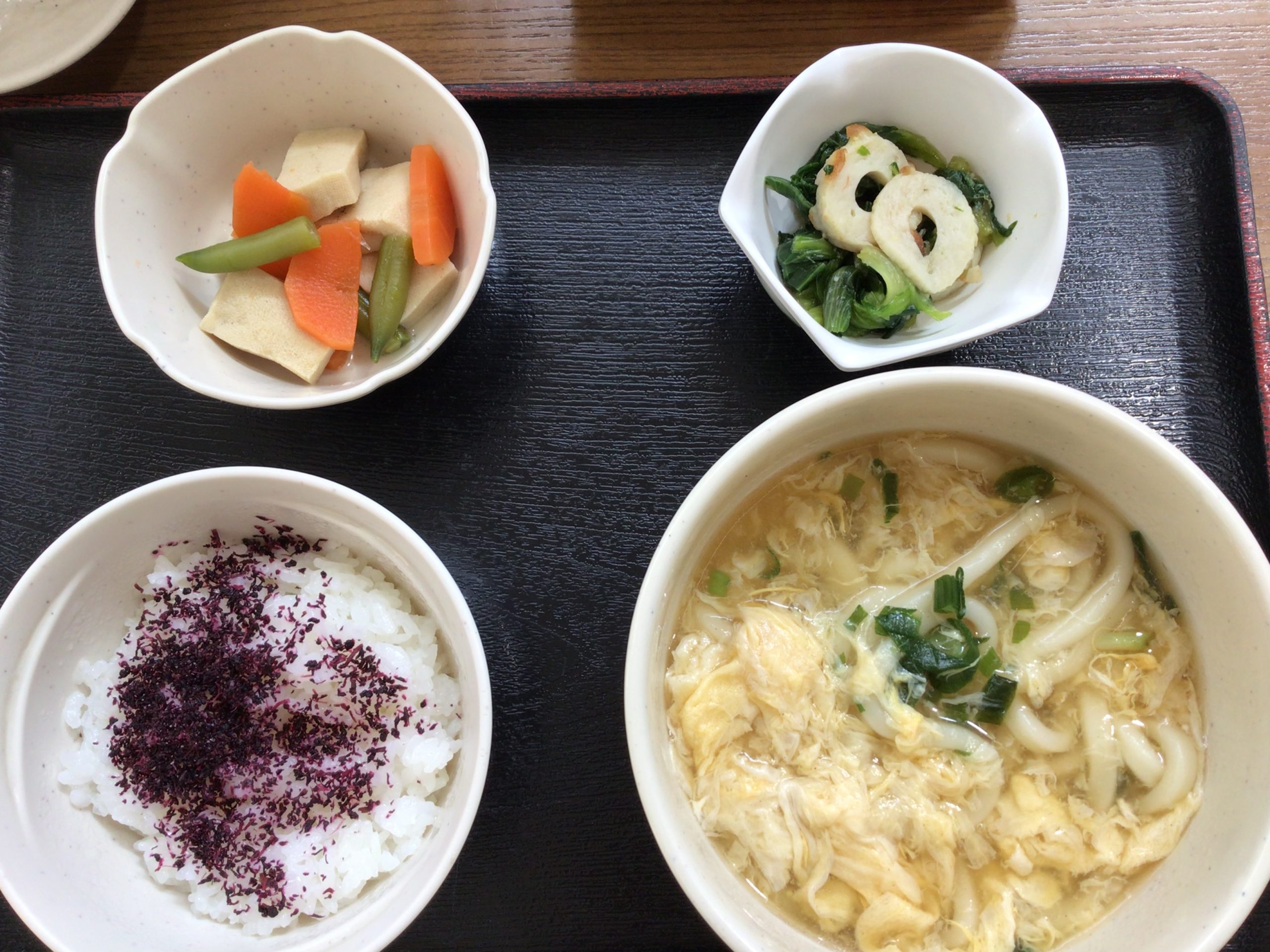 【昼食】 1.ゆかりご飯 2.卵あんかけうどん 3.高野豆腐の煮物 4.青梗菜しょうが醤油和え 578kcal 蛋白質15.2g 脂質4.6g 食塩3.6g