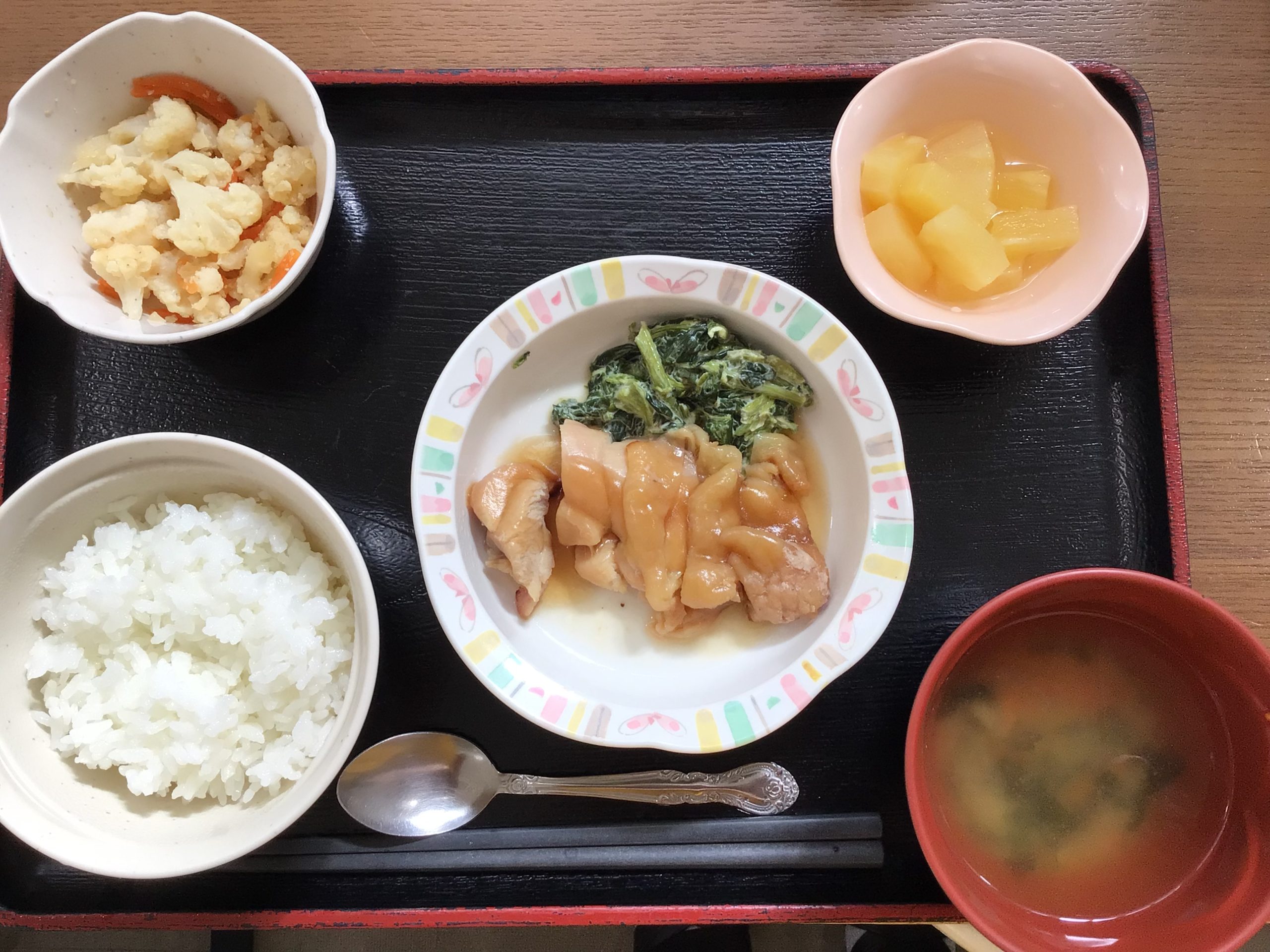 【昼食】 1.米飯 2.鶏の照焼き 3.カリフラワーごま醤油 4.フルーツ缶 5.みそ汁 649kcal 蛋白質21.3g 脂質17.2g 食塩2.7g