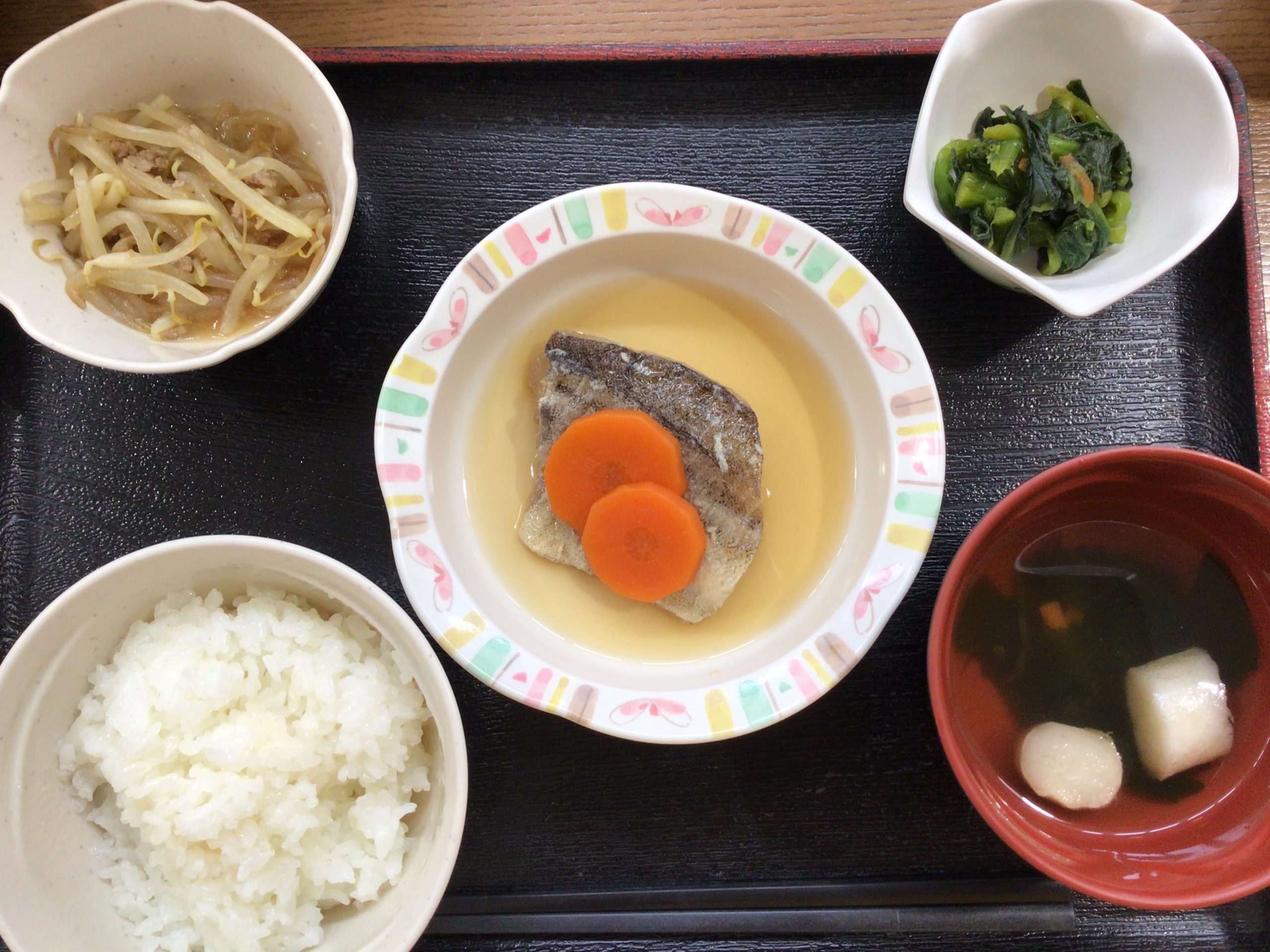 【昼食】 1.米飯 2.煮魚(たら) 3.もやしひき肉炒め 4.ゆず和え(菜の花) 5.すまし汁 485kcal 蛋白質20.8g 脂質4.0g 食塩3.9g