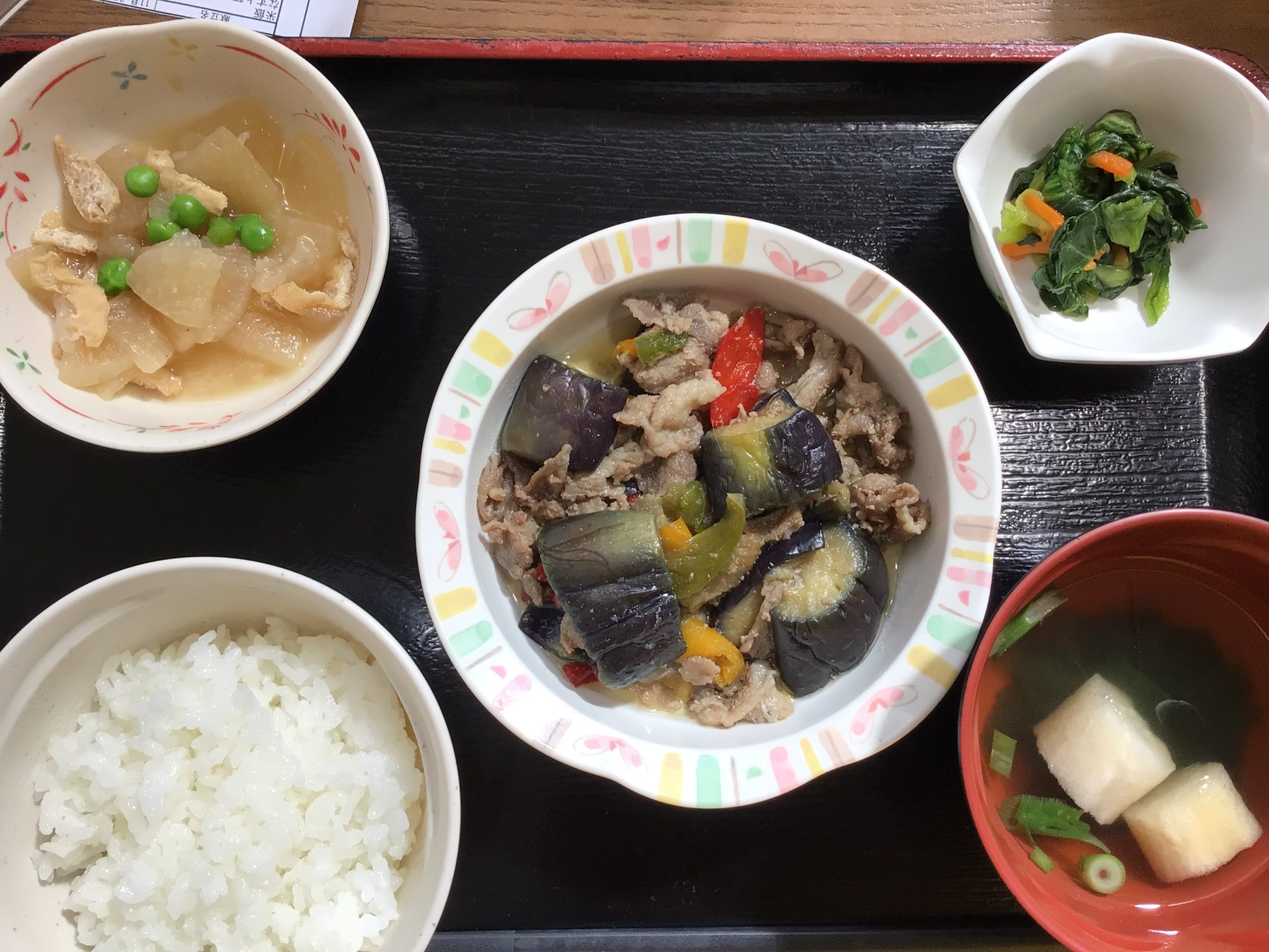【昼食】 1.米飯 2.なすと豚肉の甘辛炒め 3.煮物(大根)4.お浸し (チイゲンツァイ)5.すまし汁 711kcal 蛋白質17.9g 脂質27.2g 食塩3.7g