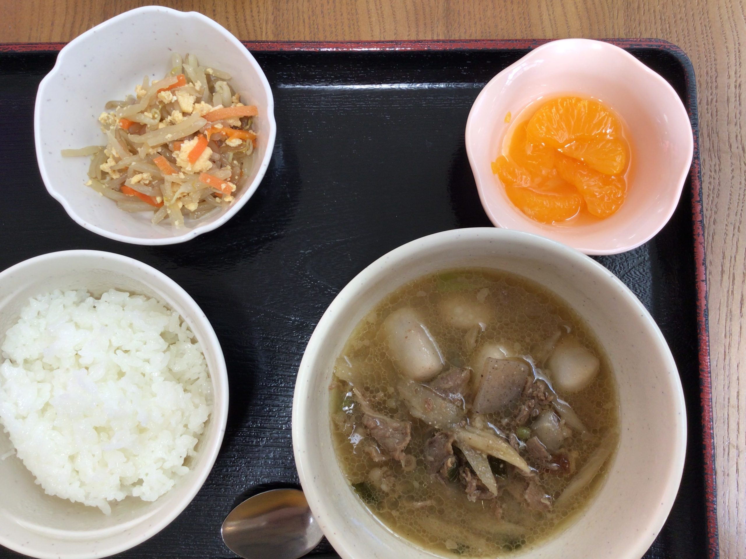 【昼食】 1.米飯 2.芋煮 3.もやしと卵の炒め物 4.フルーツ缶 553kcal 蛋白質17.6g 脂質7.3g 食塩1.6g