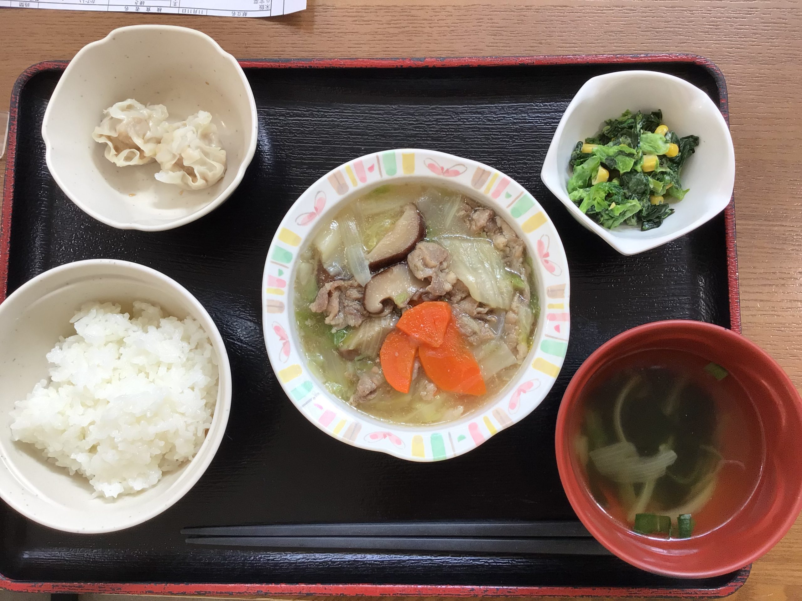 【昼食】 1.米飯 2.八宝菜 3.菜の花辛子マヨネーズ 4.蒸しシューマイ 5.中華風スープ 625kcal 蛋白質17.9g 脂質18.6g 食塩1.5g