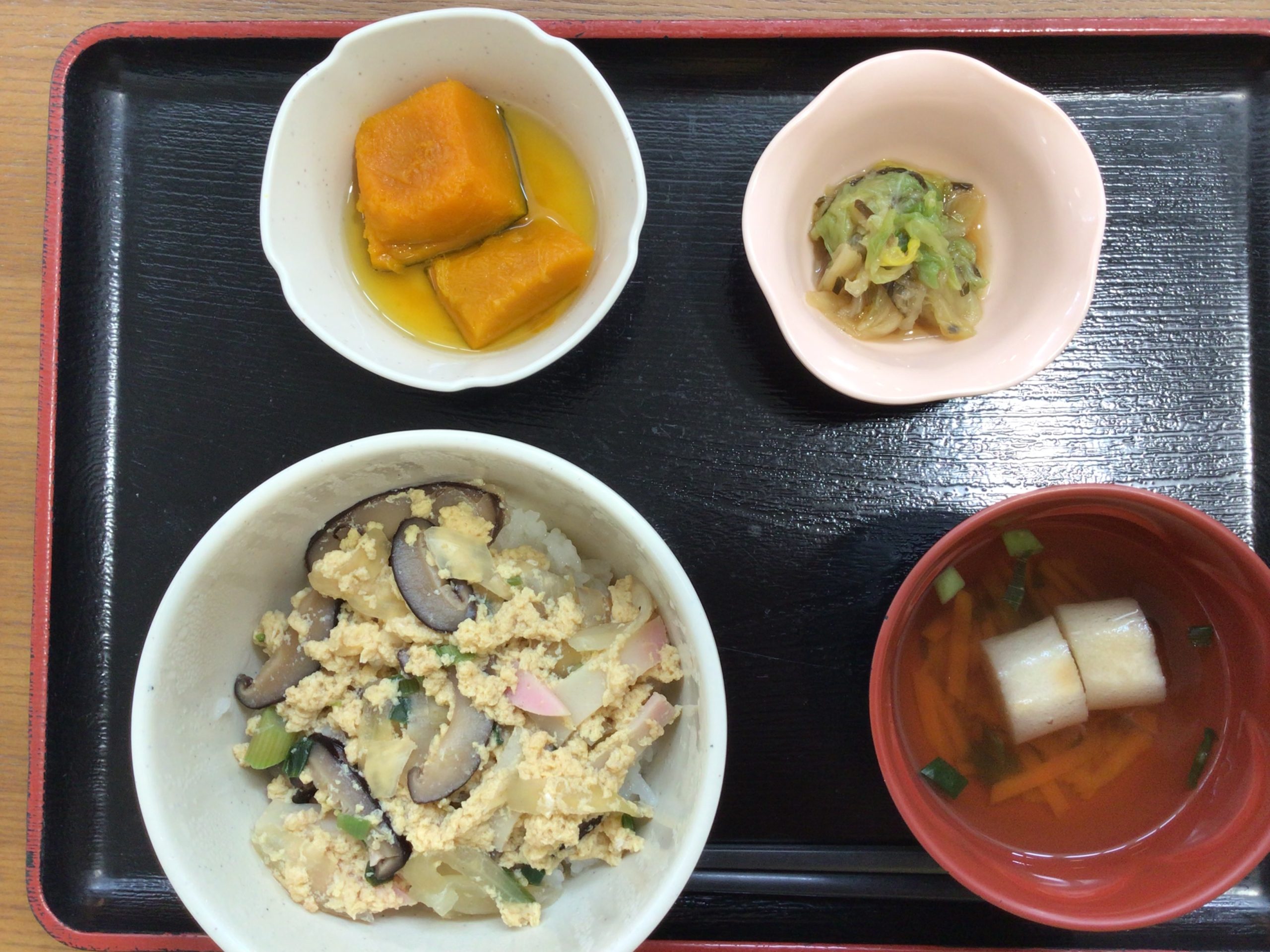 【昼食】 1.木の葉丼 2.かぼちゃ煮 3.白菜塩昆布あえ 4.すまし汁 544kcal 蛋白質16.3g 脂質6.3g 食塩4.6g
