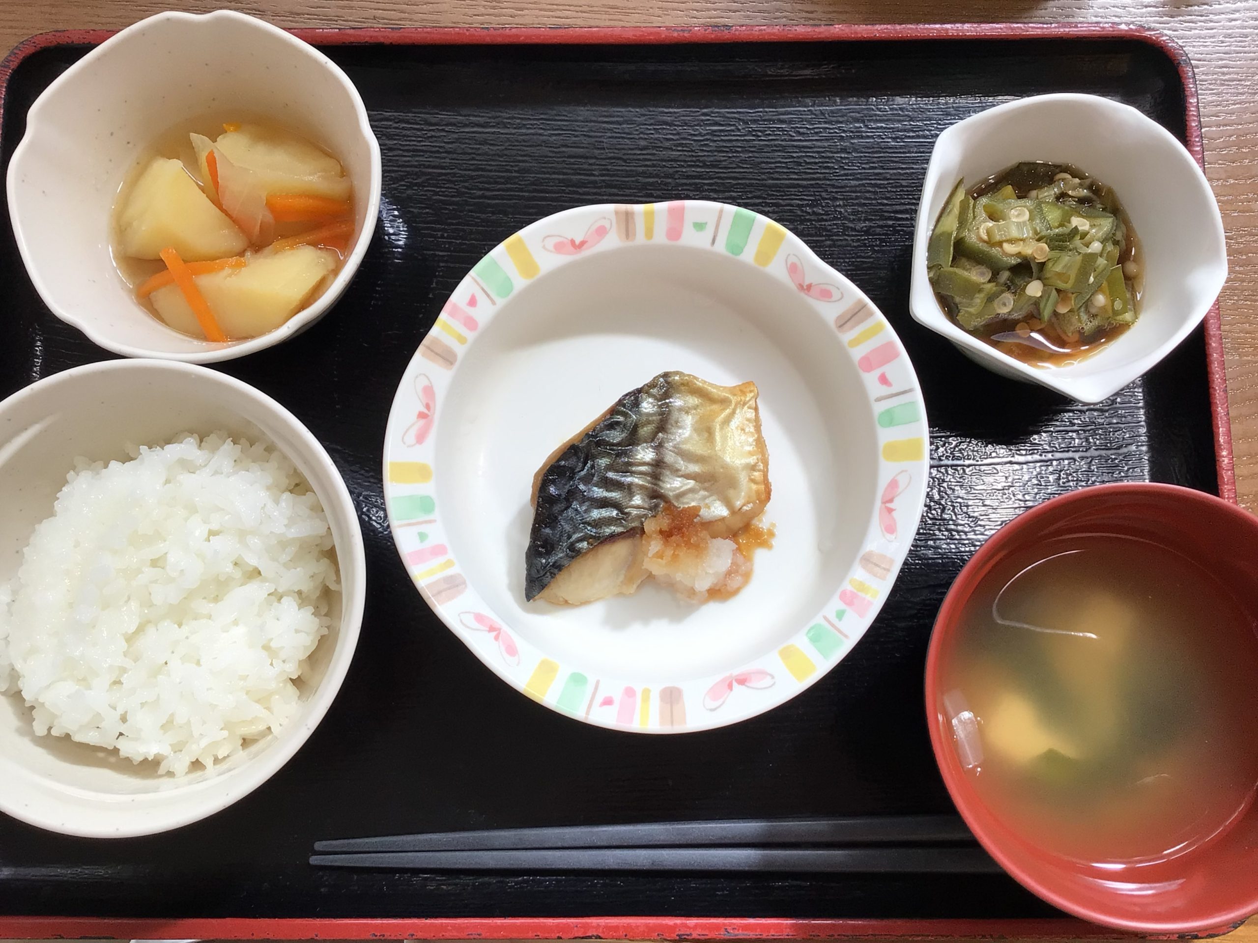 【昼食】 1.米飯 2.さばの塩焼き 3.煮物(じゃが芋) 4.おくらポン酢 5.みそ汁 581kcal 蛋白質21.6g 脂質11.5g 食塩3.2g