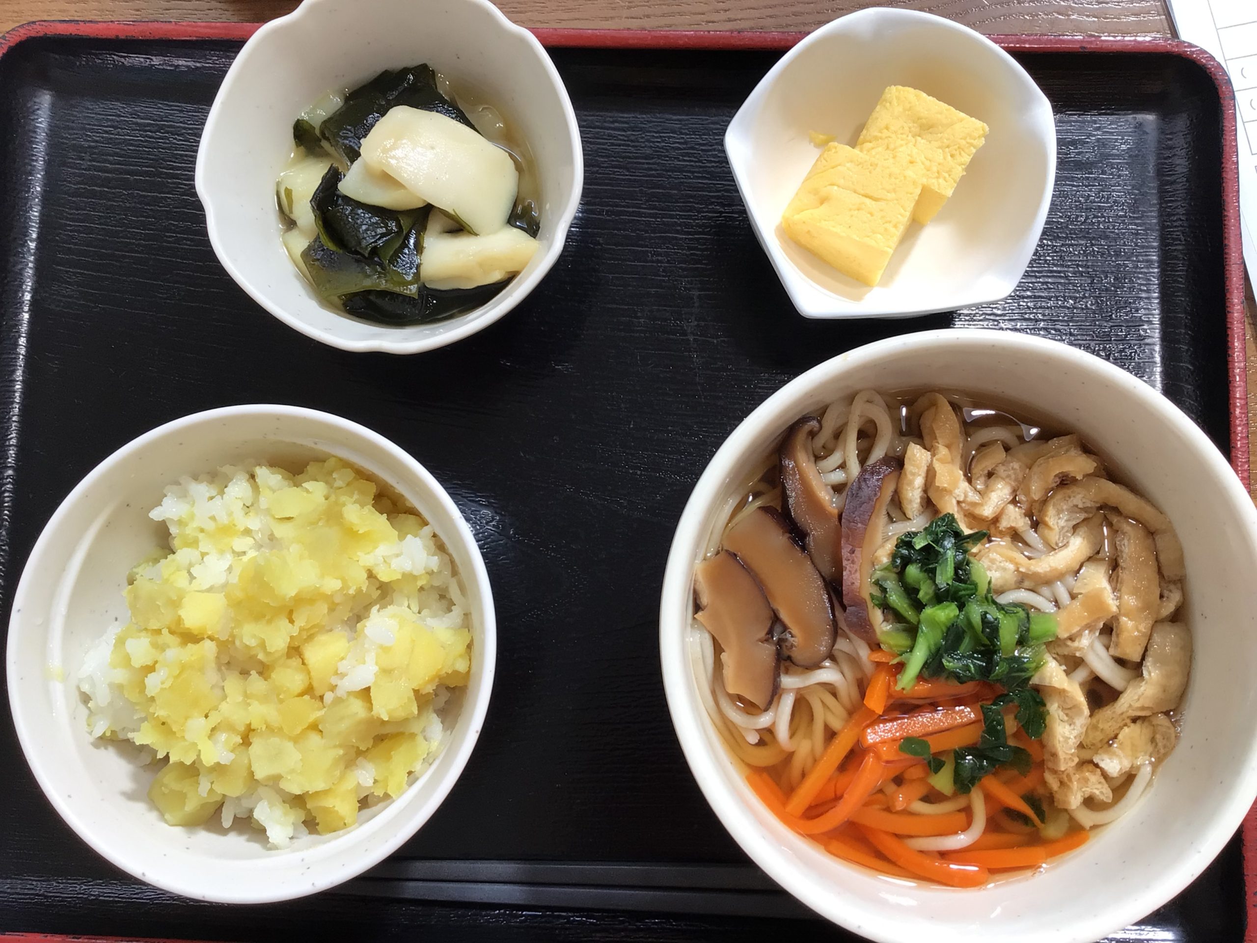 【昼食】 1.さつまいもご飯 2.田舎そば 3.はんぺんの煮物 4.卵焼き 588kcal 蛋白質16.9g 脂質3.9g 食塩3.5g