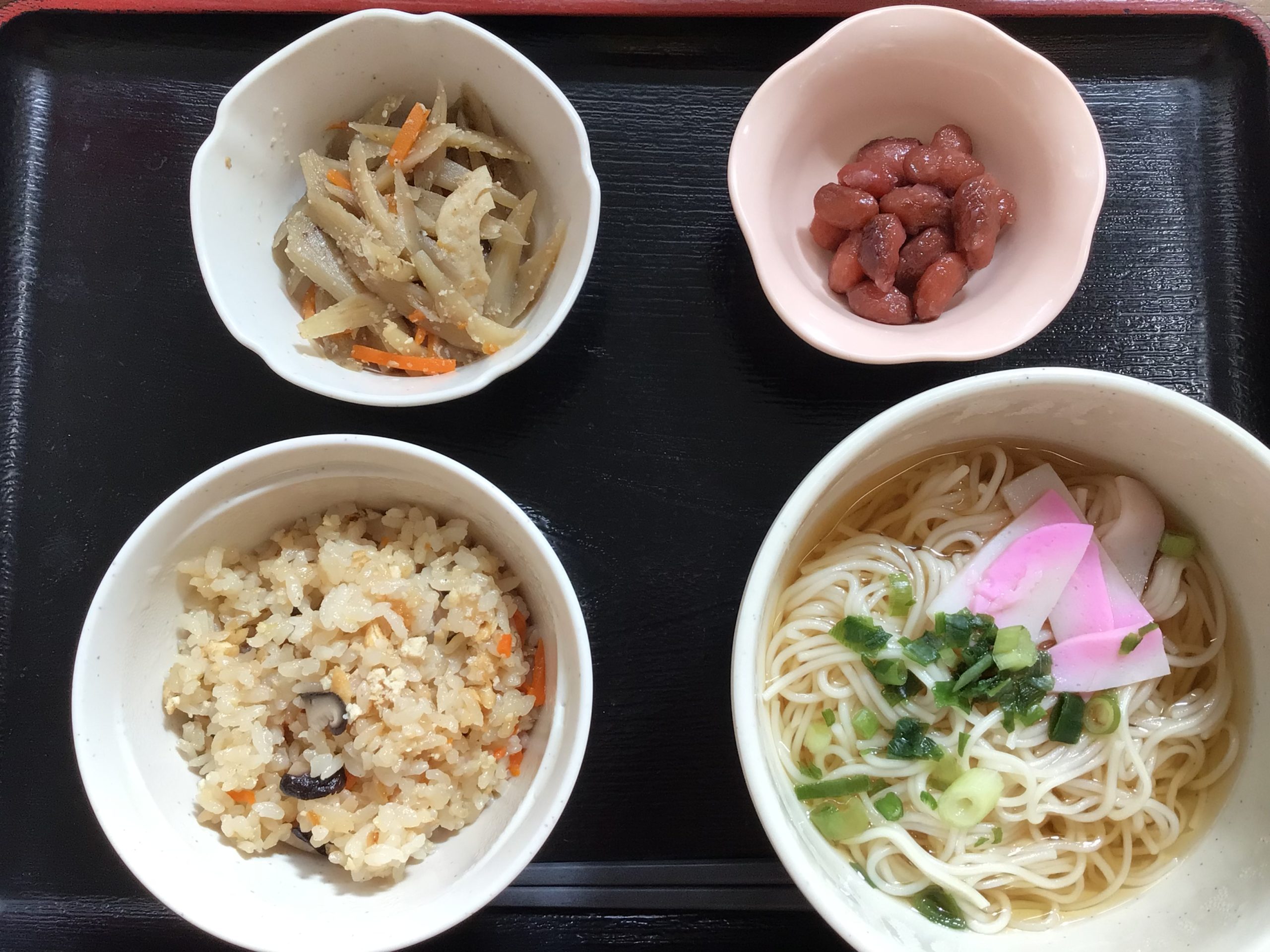 【昼食】 1.かやくご飯 2.にゅう麵 3.きんぴらごぼう 4.金時豆煮 641kcal 蛋白質17.4g 脂質4.9g 食塩4.6g